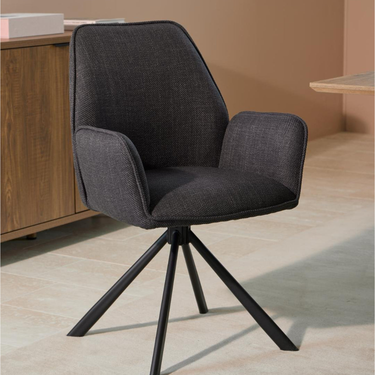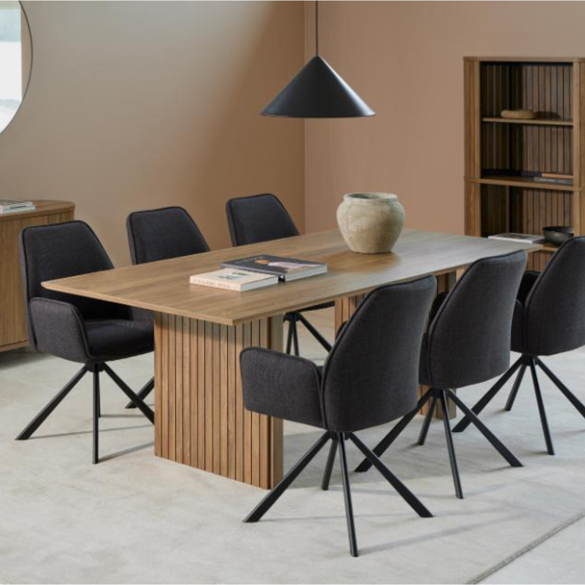 Laat jouw eetkamer stralen met de Aske eetkamerstoel door zijn strakke lijnen en een eigentijdse uitstraling. Neem plaats op een comfortabele zitting, bekleed met een antraciet stof die een subtiele tweekleurige uitstraling heeft. Het detail van het biesjes is echt een eyecatcher.