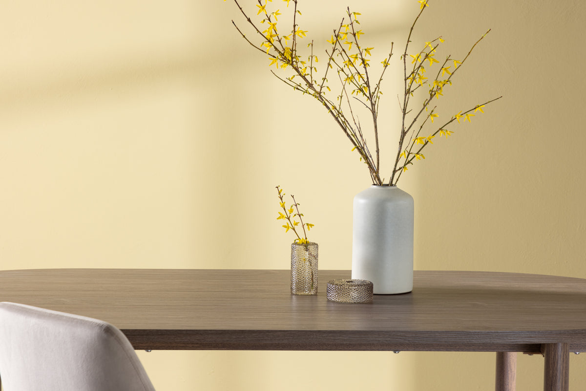 De verfijnde eetkamertafel Aspberg straalt klasse uit. Het prachtige ovale blad biedt voldoende ruimte voor gezellige diners en gesprekken met vrienden en familie. De rijke walnoot kleur en de natuurlijke houtnerf voegen een vleugje rustieke schoonheid toe aan elke eetruimte. <meta charset="UTF-8">De consistente natuurlijke kleur is gemakkelijk te matchen en veroudert nooit.