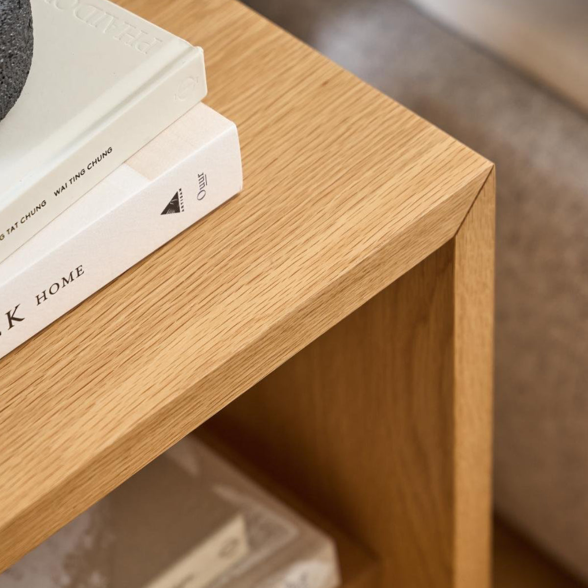 Haal minimalistische elegantie in je slaapkamer met het Boher nachtkastje! Dit strakke, rechthoekige tafeltje straalt eenvoud uit met zijn heldere lijnen en verfijnde uitstraling. Gemaakt van gelakt eiken fineer, voegt het een warme en natuurlijke touch toe aan elke ruimte.