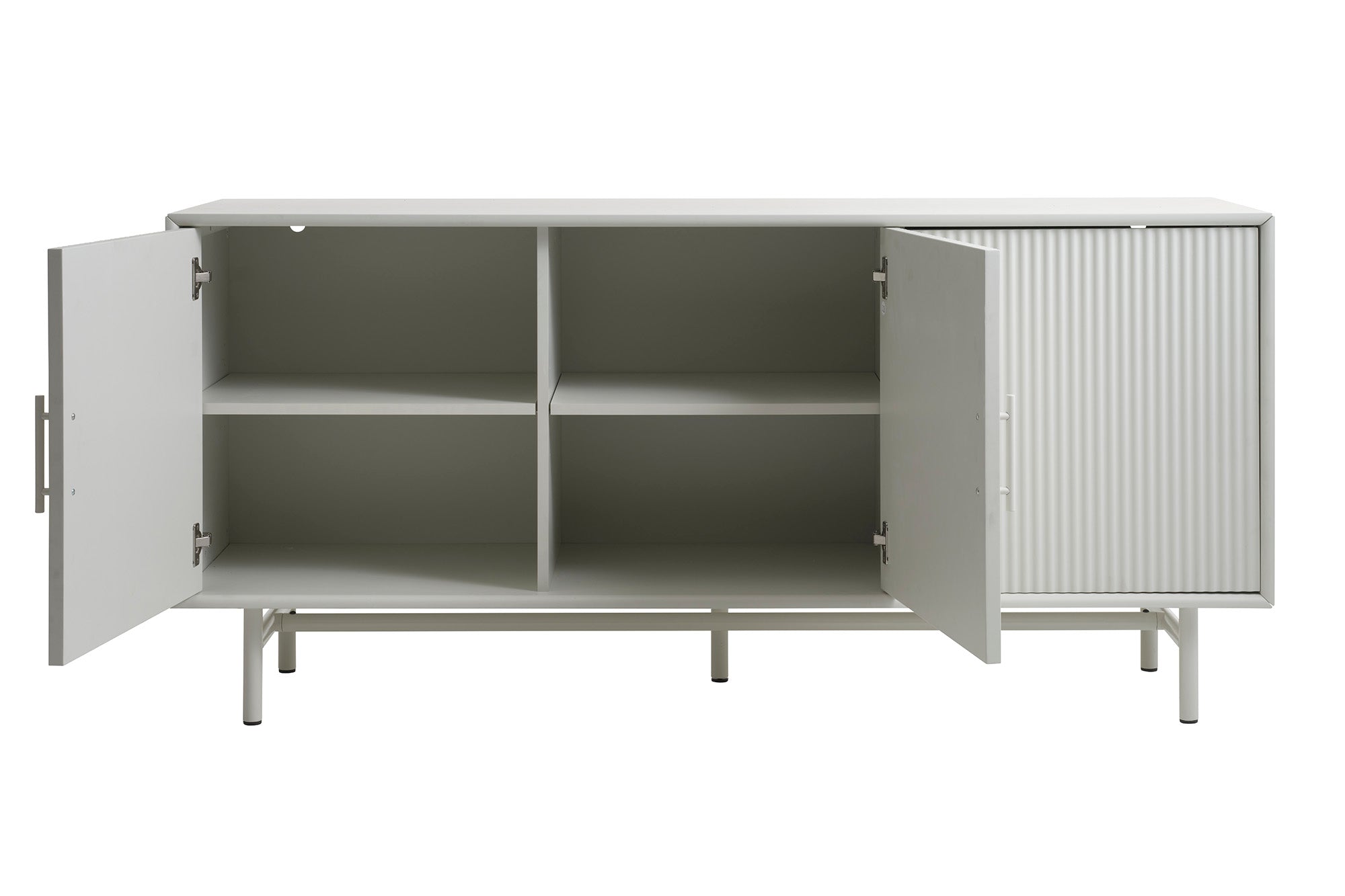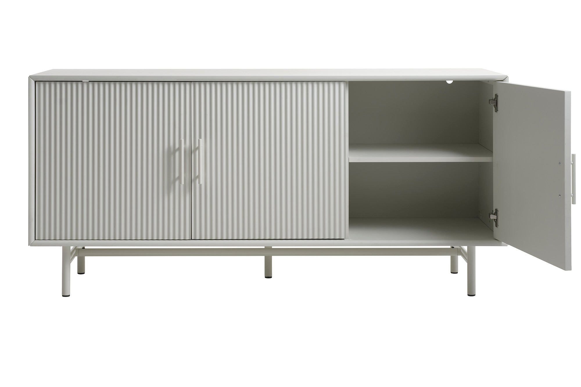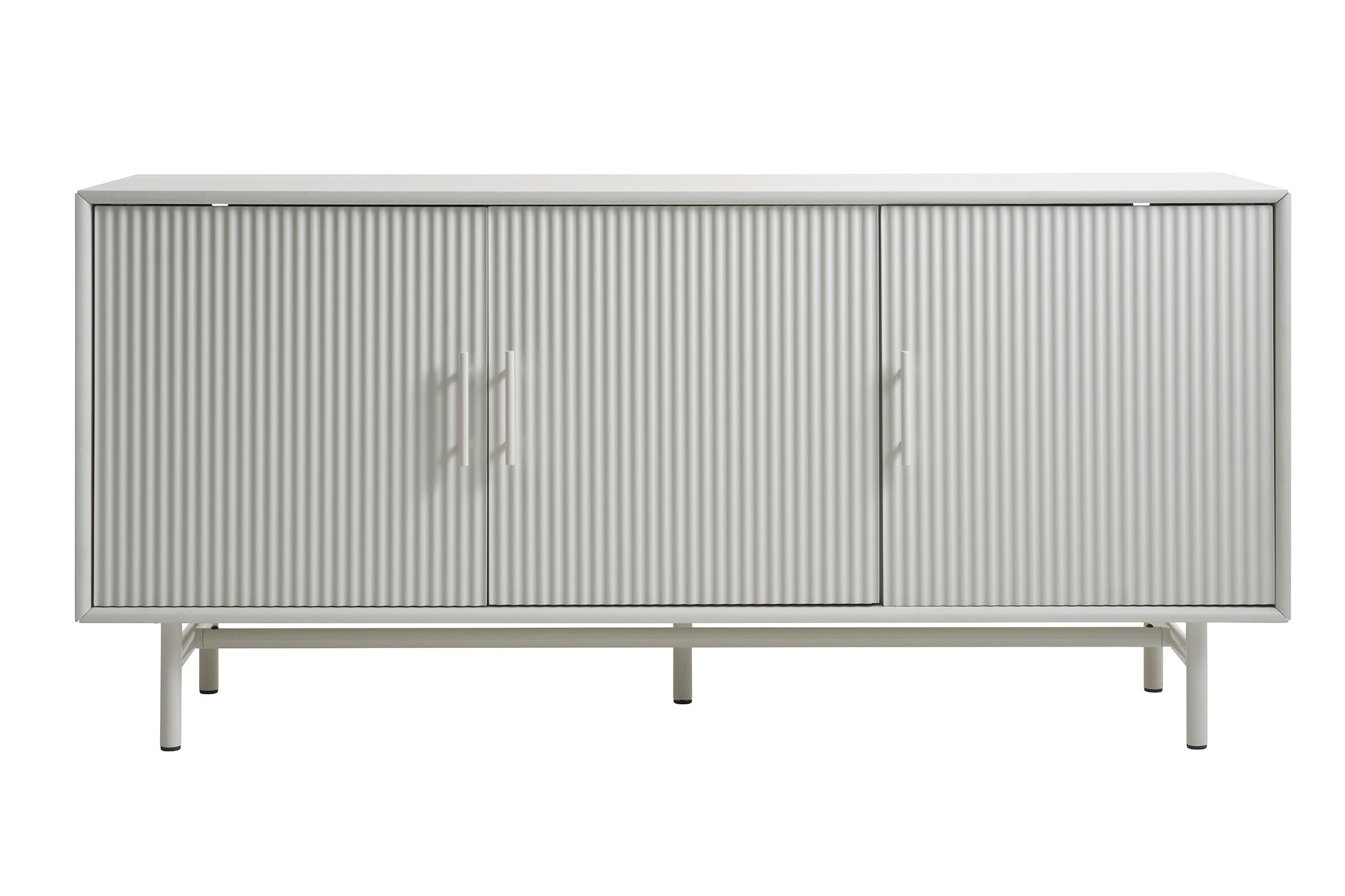 Het dressoir is vervaardigd van hoogwaardig MDF en is afgewerkt in een tijdloze greige kleur die een vleugje verfijning toevoegt aan je interieur. De drie deuren zijn voorzien van geribbelde fronten, wat een speels en eigentijds karakter geeft aan het ontwerp.
