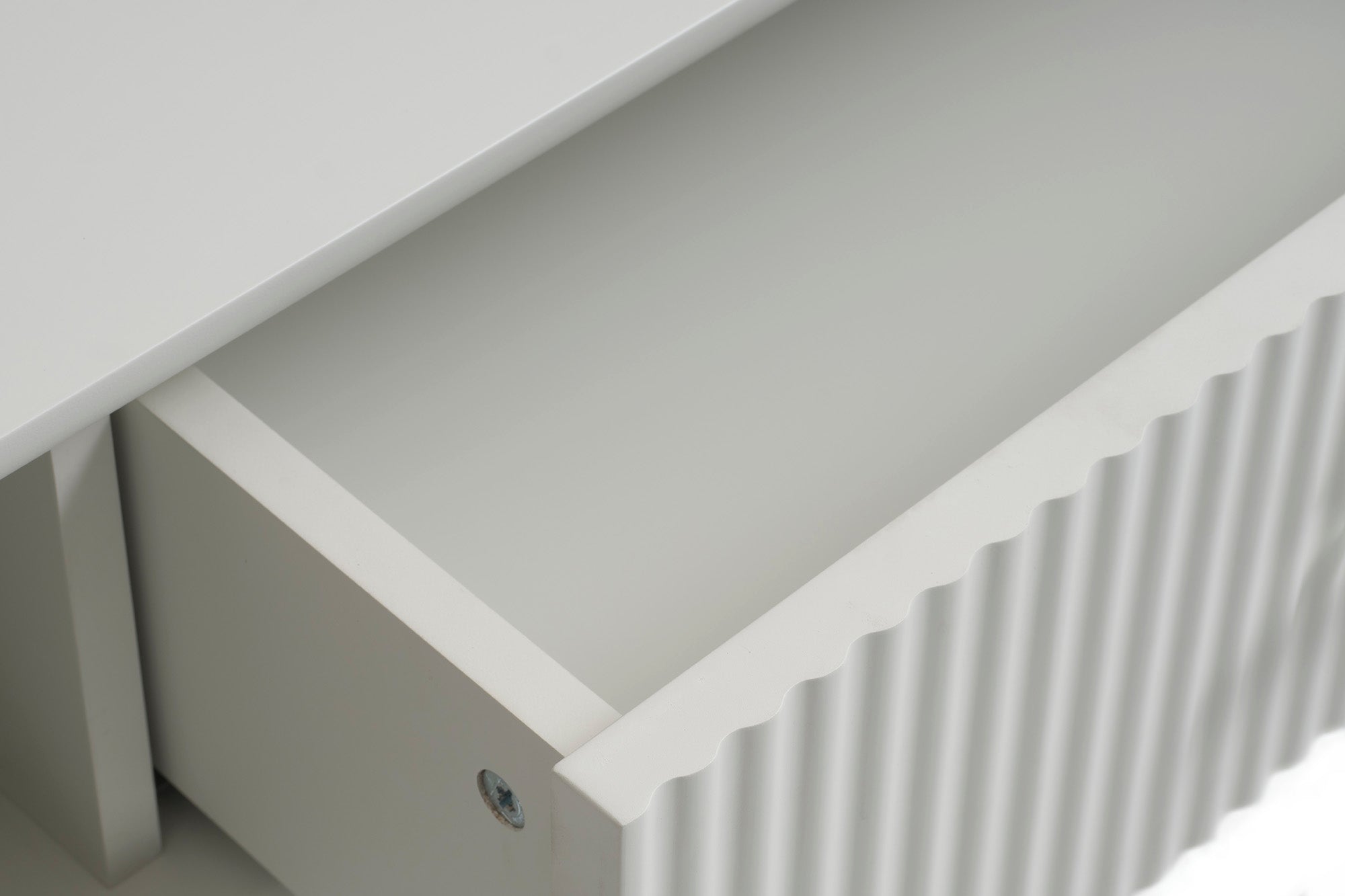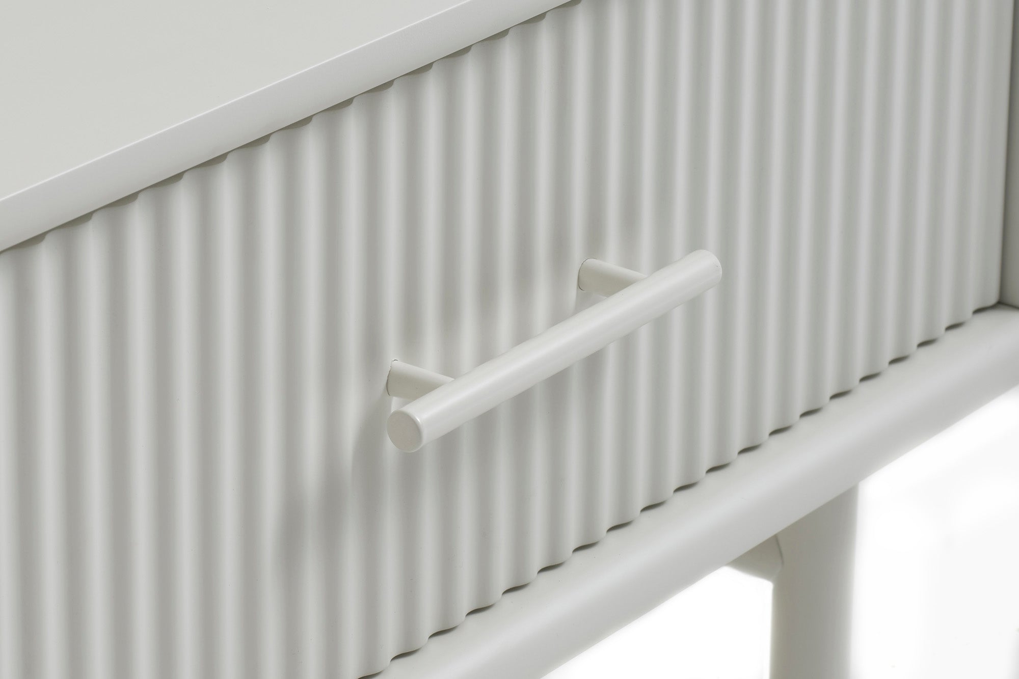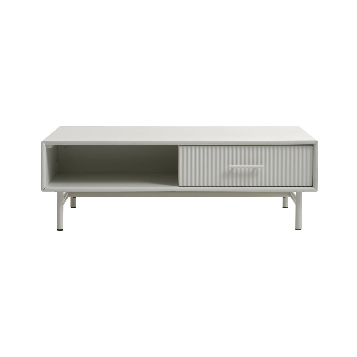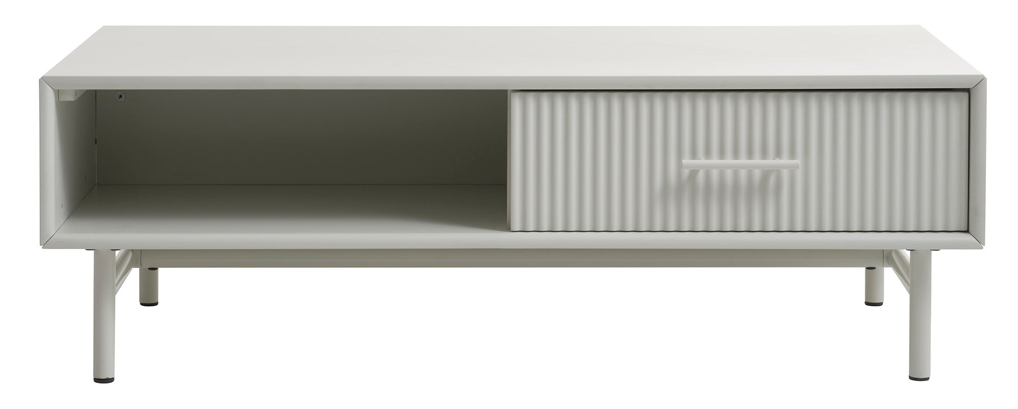 De salontafel is vervaardigd van hoogwaardig materiaal en heeft een verfijnde greige kleur die moeiteloos in elke woonkamer past. De geribbelde front van de lade voegt een speels element toe aan het ontwerp, terwijl de metalen details als handvat en tafelpoten zorgen voor een subtiel industrieel accent.