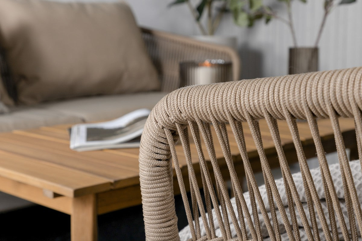 Onderhoudstips: Het hoogwaardige polyester touw is eenvoudig te reinigen met zeep en water. De meubels zijn behandeld voor langdurig buitengebruik, maar we raden aan ze droog en beschermd te bewaren voor optimale duurzaamheid.