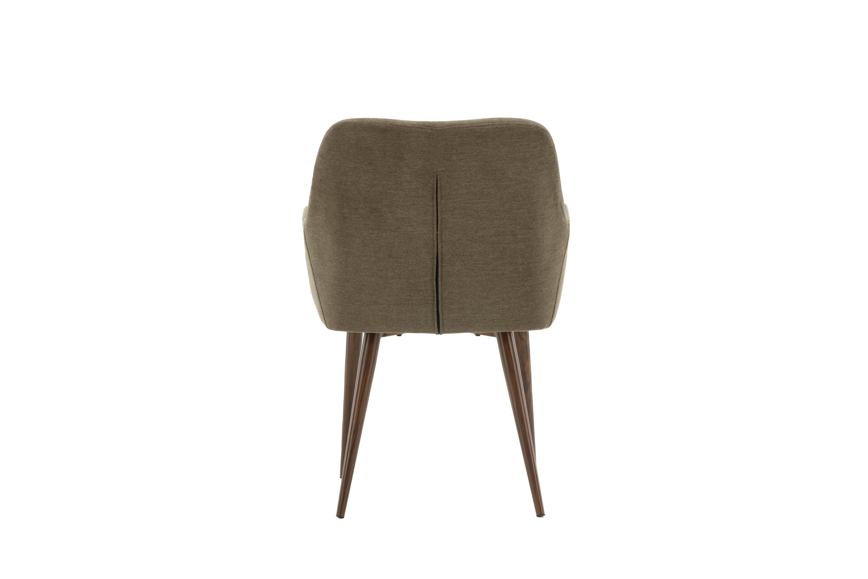 - De volledig beklede zitting met geïntegreerde armleuningen is gemaakt van bruine polyester stof en de stoelpoten zijn elegant vormgegeven.