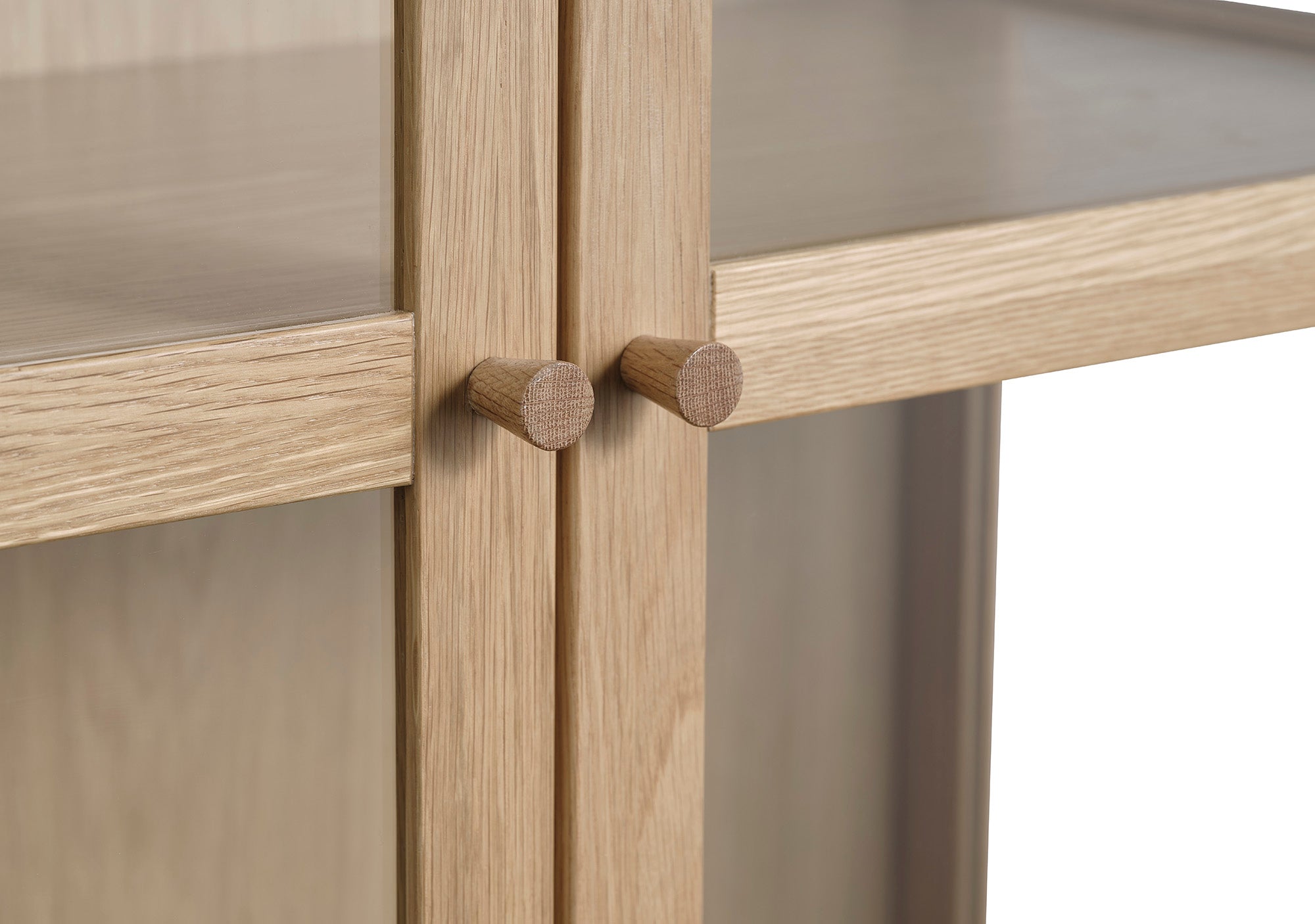Materialen: Frame: Spaanplaat/MDF + Eikenfineer, Deurtjes: Gehard Glas
