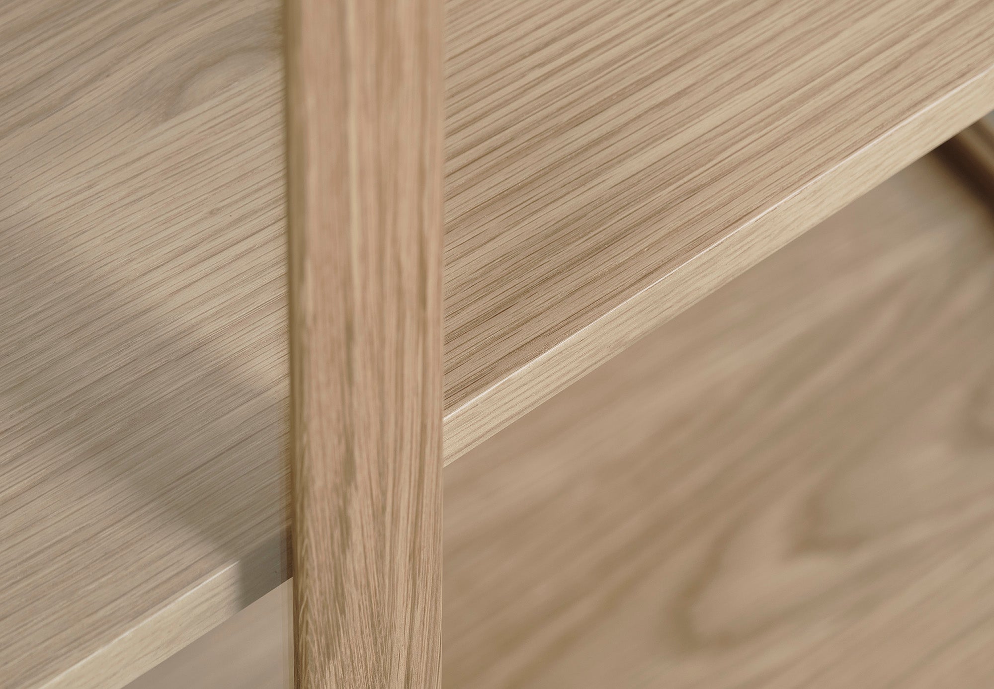 Wat de Foxton Vitrinekast echt uniek maakt, is zijn eikenhouten uitstraling en deurtjes met gehard glas. Deze combinatie zorgt voor een warme en uitnodigende sfeer, terwijl de gehard glazen deurtjes een moderne en luchtige uitstraling bieden. De kast staat elegant op pootjes, waardoor hij een verfijnde en lichtvoetige indruk maakt in je interieur.