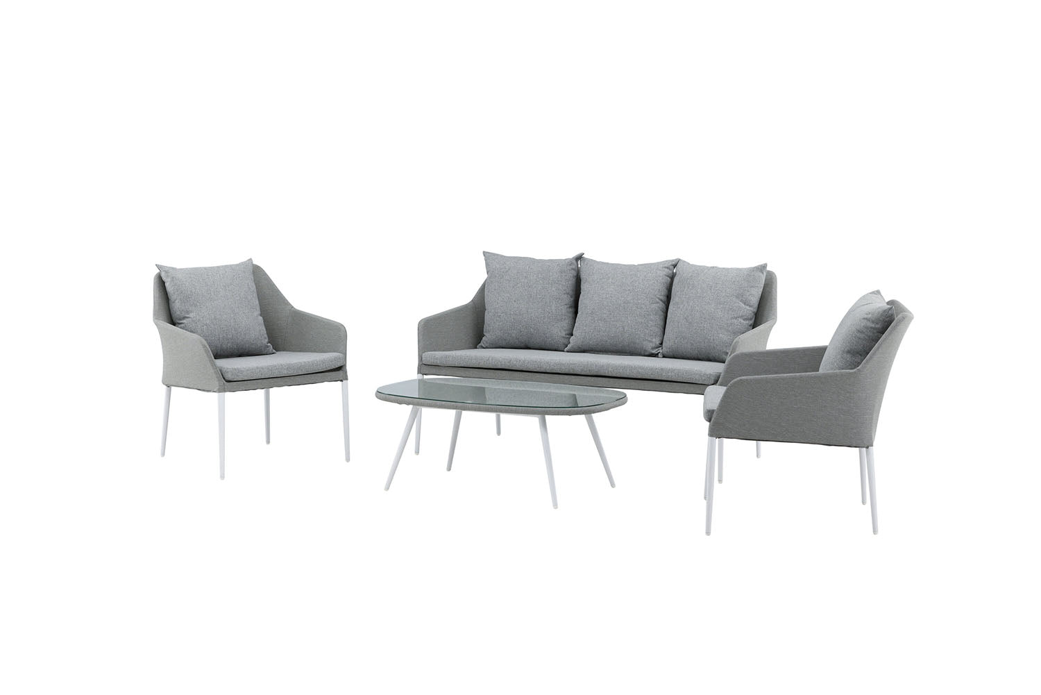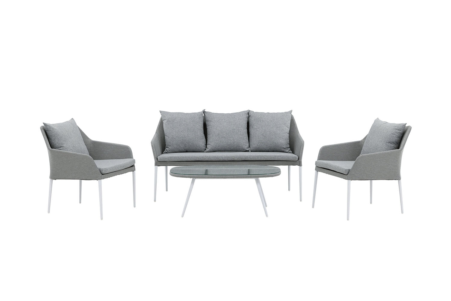 Haze is een moderne loungeset met de nadruk op comfort. De loungeset past perfect op het terras of in de tuin. De loungeset bestaat uit een tweezitsbank en twee fauteuils. In de set zijn ook grijze zachte kussens inbegrepen, evenals een ovale lage salontafel met een tafelblad van helder glas dat een exclusief uitstraling creëert. Geniet van comfortabele zomeravonden in deze aangename loungeset!
