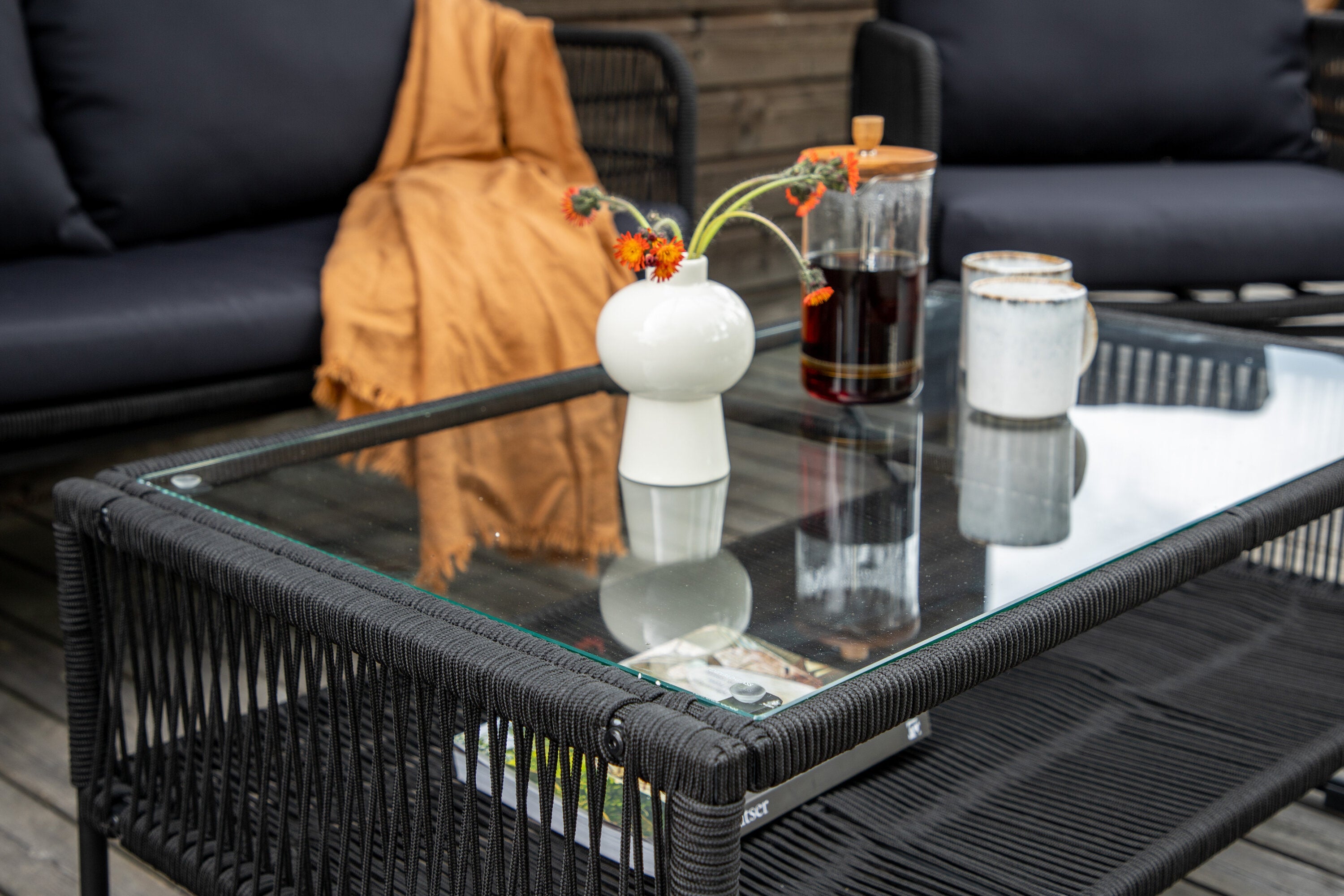 Maak kennis met de gezellige loungeset Hibis. Deze aangename loungeset in modern design bestaat uit een tweezitsbank, twee fauteuils gemaakt van zwart gepoedercoat metaal met een rugleuning en zijpanelen in zwart touw. Inbegrepen in de loungeset zijn een rechthoekige lage salontafel met een tafelblad van glas en de zachte zwarte kussens. Laat je inspireren door een trendy design en geniet van late zomeravonden in een comfortabele loungeset!