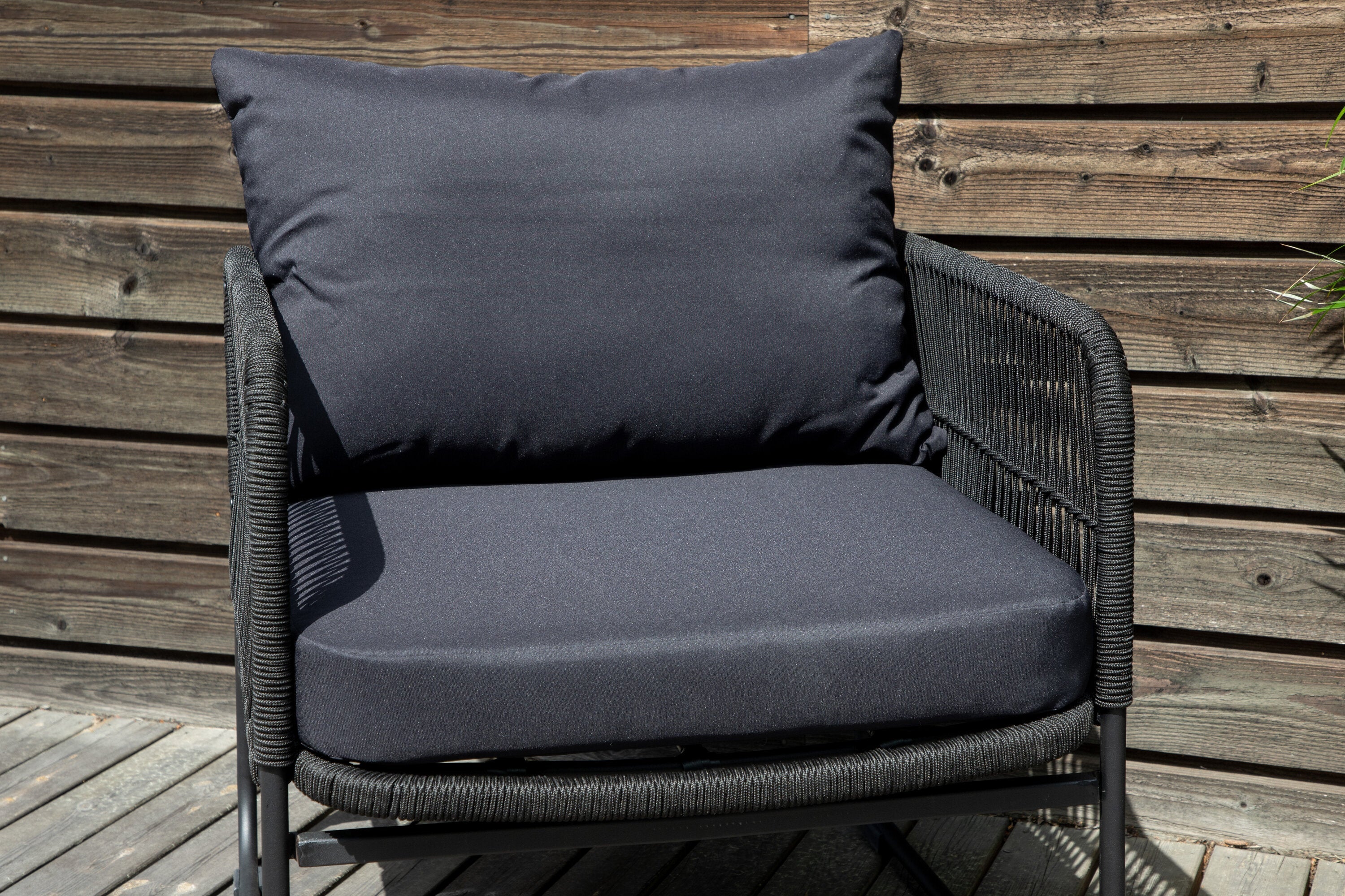 - Ontdek de gezellige loungeset Hibis met modern design en zachte zwarte kussens.