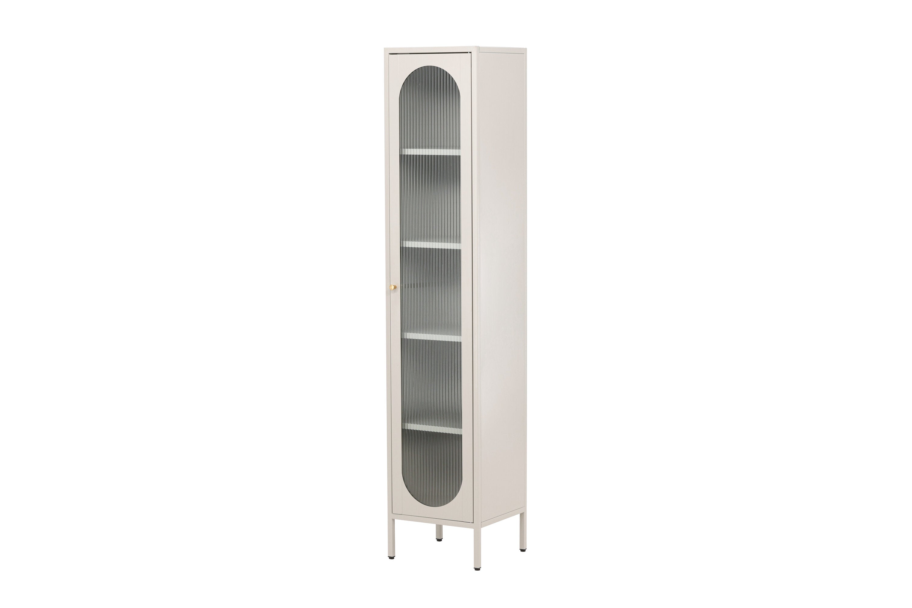 Makani is een elegante greige kast gemaakt van staal, wat zorgt voor een stabiele en duurzame constructie. Zijn moderne en minimalistische ontwerp zal een smaakvolle toevoeging zijn aan je huis. De kast beschikt over vier royale schappen, die volop ruimte bieden voor organisatie. De twee deuren zijn gemaakt van golvend glas, wat een interessante visuele dimensie en een vleugje textuur aan het meubelstuk toevoegt.