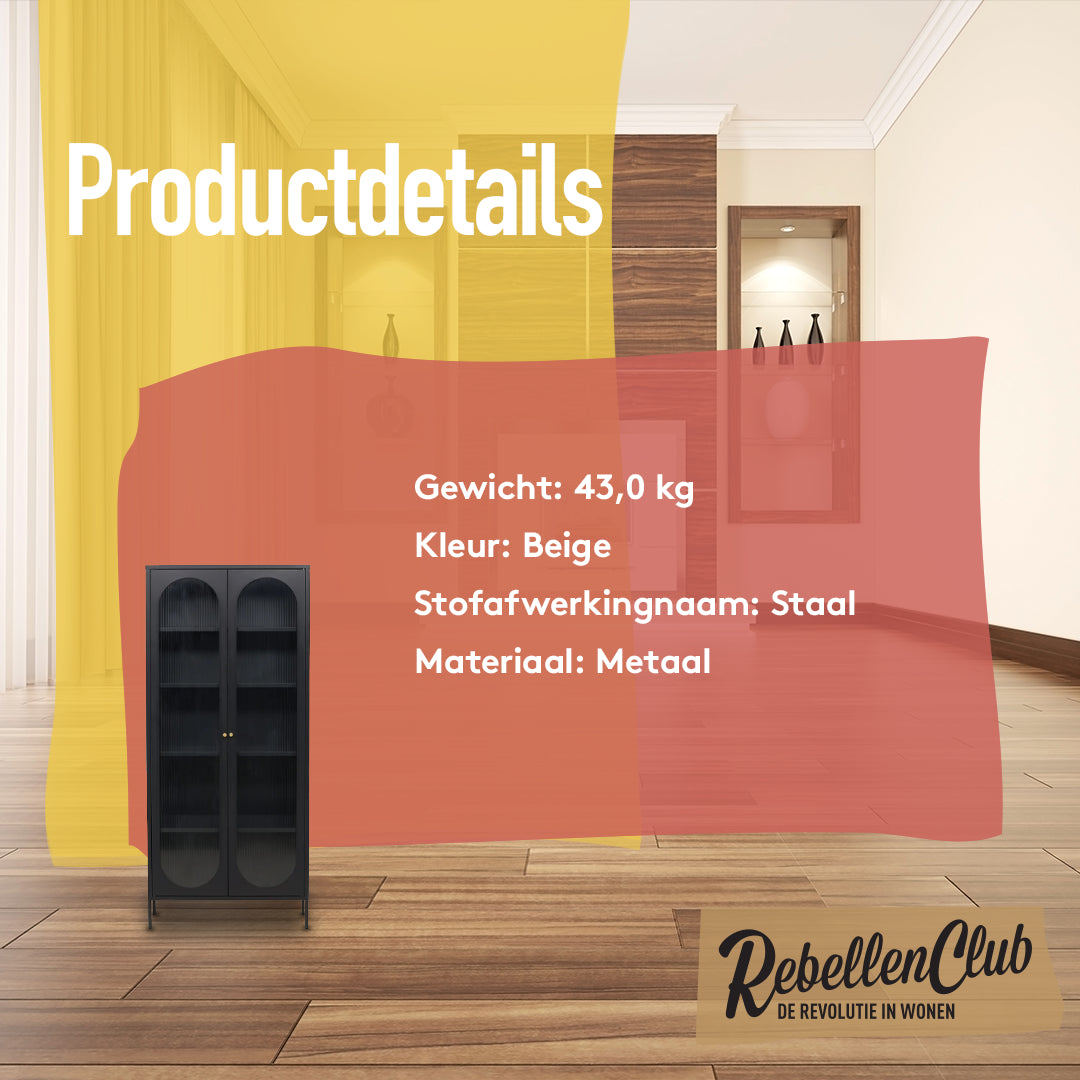 Makani is een elegante beige kast gemaakt van staal, wat zorgt voor een stabiele en duurzame constructie. Zijn moderne en minimalistische ontwerp zal een smaakvolle toevoeging zijn aan je huis. De kast beschikt over vier royale schappen, die volop ruimte bieden voor organisatie. De twee deuren zijn gemaakt van golvend glas, wat een interessante visuele dimensie en een vleugje textuur aan het meubelstuk toevoegt.