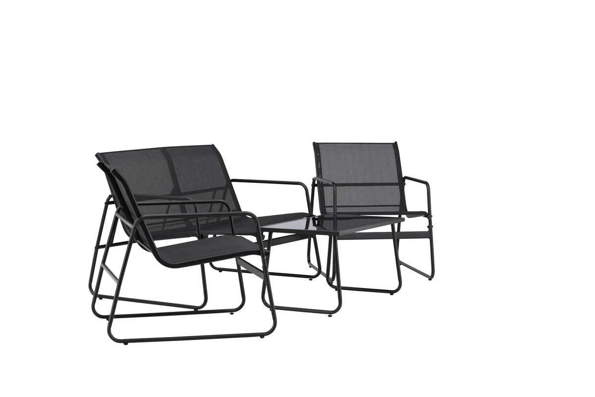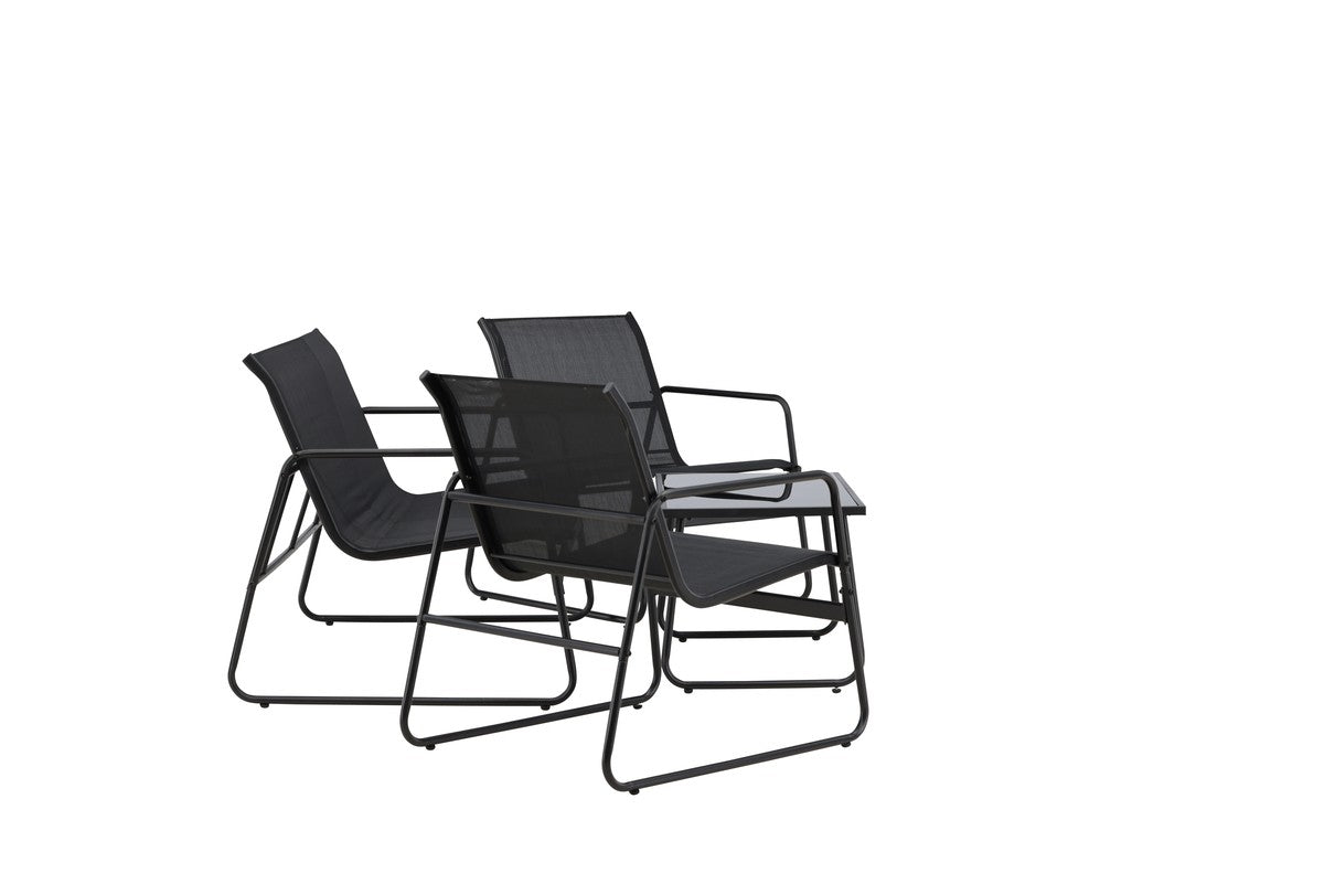 Het zitmeubilair heeft een stevig stalen frame en een textilene zitting, die zowel omhullend comfort biedt als zeer duurzaam is voor buitengebruik. De bijbehorende tafel, met een elegante stalen constructie en een strakke glazen top, maakt het geheel af en creëert een verfijnde sfeer die je uitnodigt om volledig van de zomer te genieten.