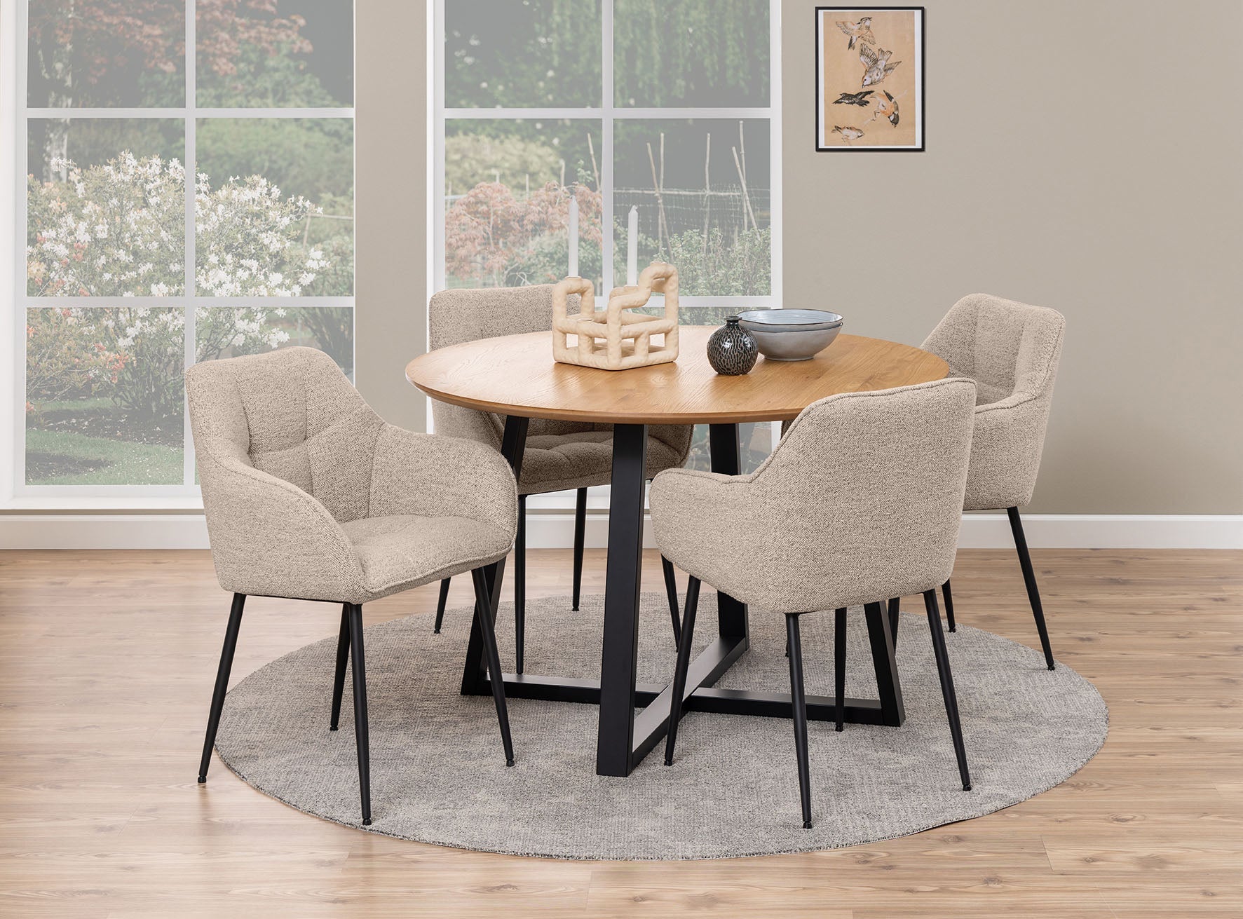 Deze comfortable eetkamerstoel draagt de naam Nivala. Met zijn subtiele loungelook kun je eten en ontspannen tegelijkertijd. De zachte, beige bekleding nodigt uit tot langdurig zitten, terwijl de armleuningen extra gemak bieden. De robuuste zwarte basis voegt een eigentijdse uitstraling toe en zorgt voor stabiliteit, zodat je met een gerust hart kunt genieten van je maaltijden en ontspannen momenten.