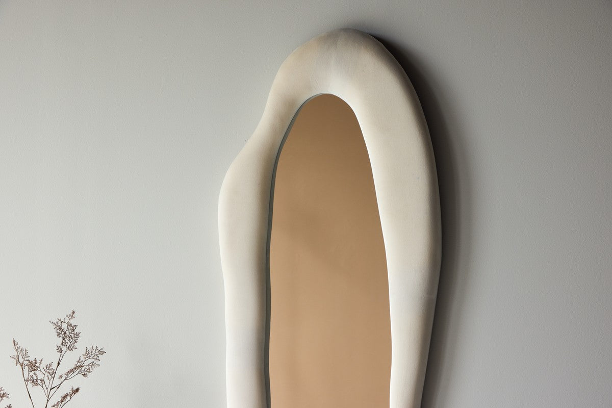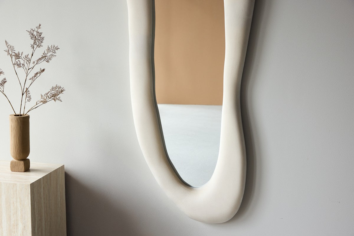 De spiegel zelf is gemaakt van hoogwaardig glas, helder en strak afgewerkt voor een loepzuiver beeld. De omlijsting heeft een zachte, almost sculpturale uitstraling en geeft warmte aan het geheel. Ideaal voor in de hal, slaapkamer of woonkamer, overal waar je een vleugje zachtheid én stijl kunt gebruiken.