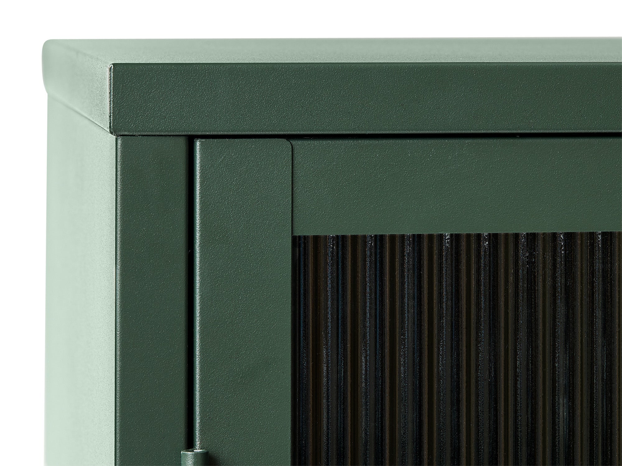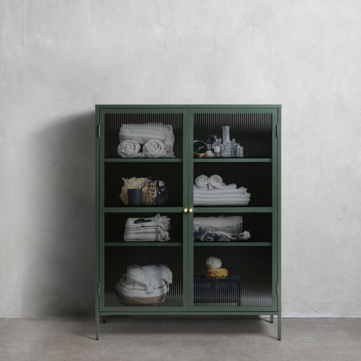 Wat de Omeo Vitrinekast echt uniek maakt, is zijn uitgesproken kleur groen, wat direct de aandacht trekt en een krachtig statement maakt in elke ruimte. De kast is voorzien van twee glazen deuren met prachtige geribbelde glasdetails, die niet alleen een stijlvolle uitstraling geven, maar ook zorgen voor een subtiel spel van licht en schaduw in de kast. De messing knop voegt een vleugje luxe toe aan het geheel.