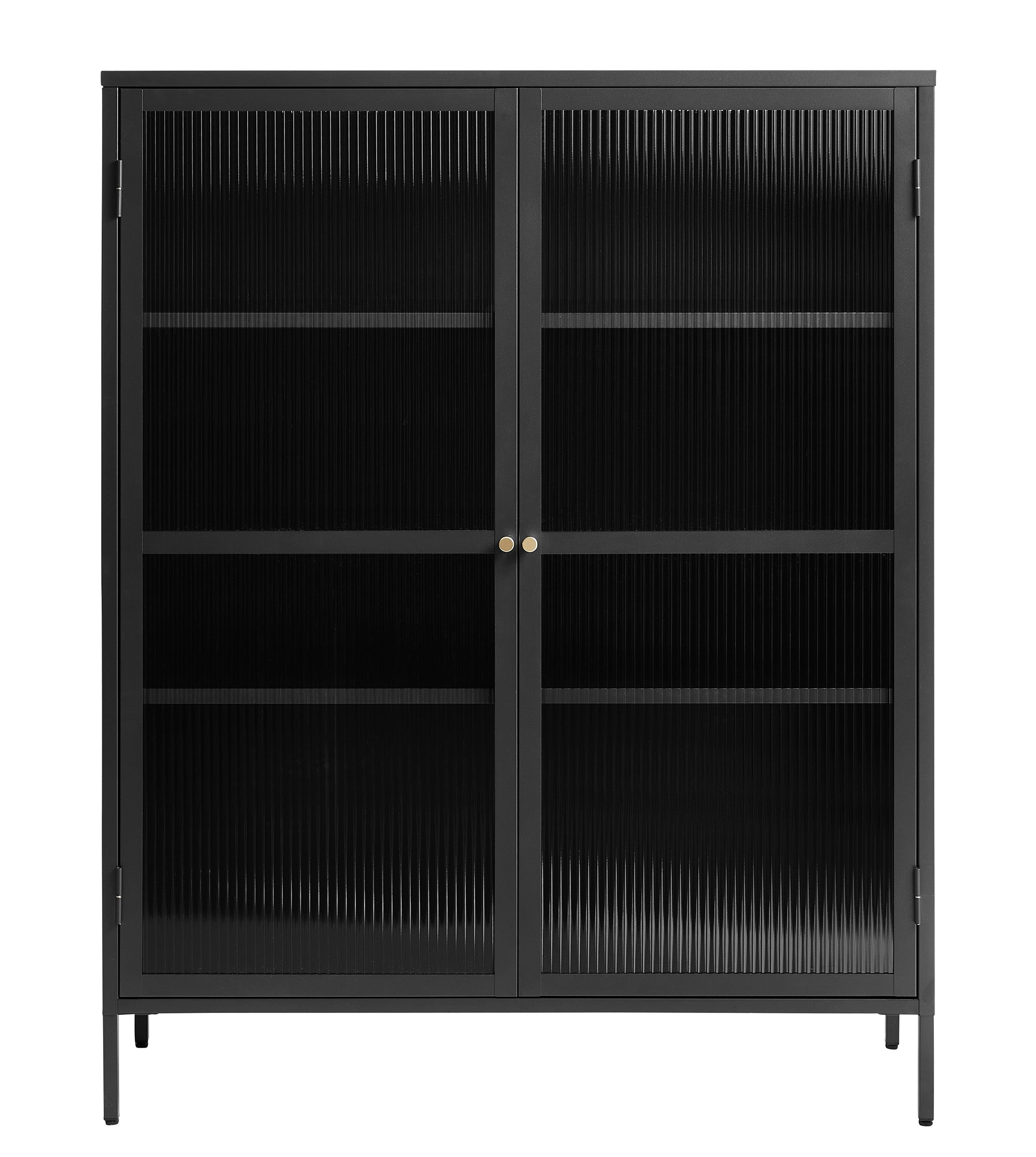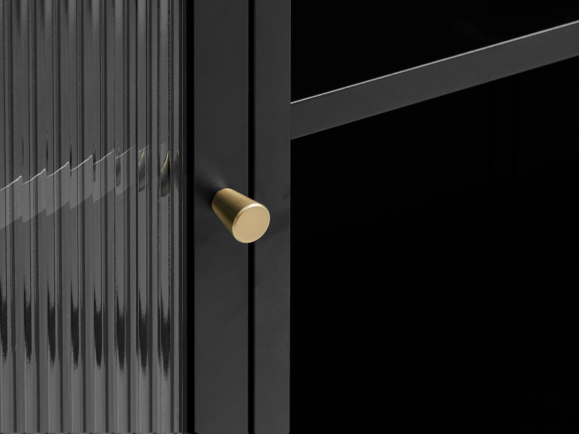 Wat de Omeo Vitrinekast echt uniek maakt, is zijn tijdloze kleur zwart, wat een krachtig statement maakt in elke ruimte. De kast is voorzien van twee glazen deuren met prachtige geribbelde glasdetails, die niet alleen een stijlvolle uitstraling geven, maar ook zorgen voor een subtiel spel van licht en schaduw in de kast. De messing knop voegt een vleugje luxe toe aan het geheel.