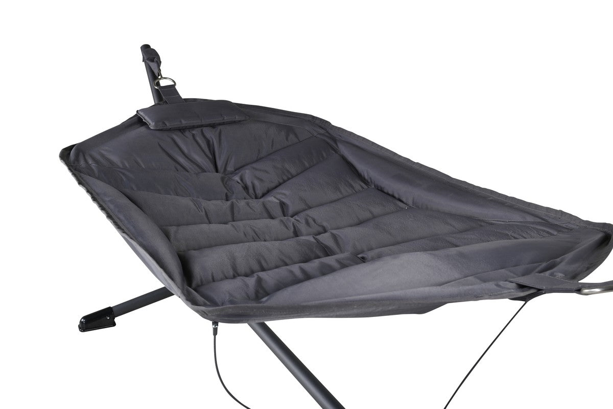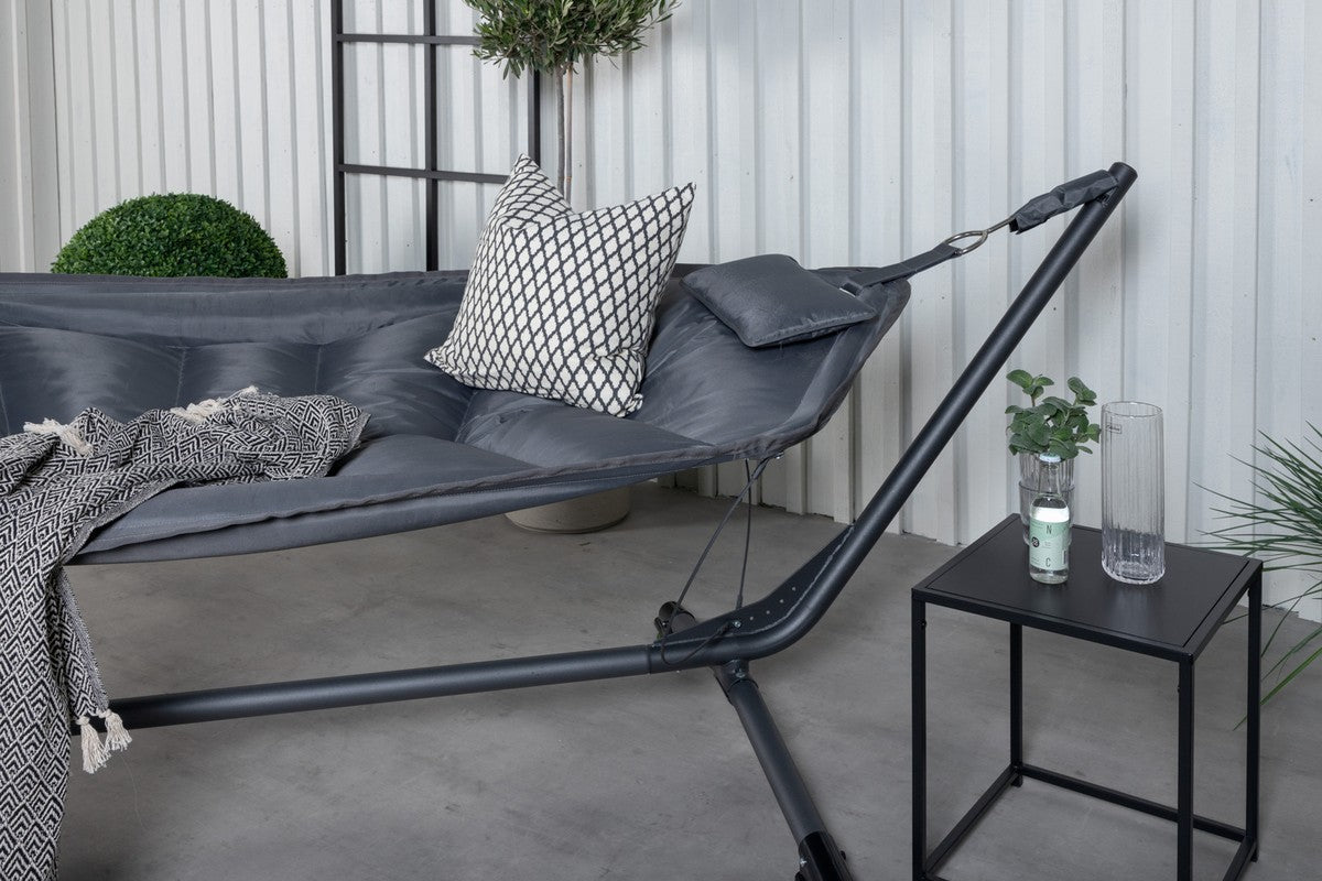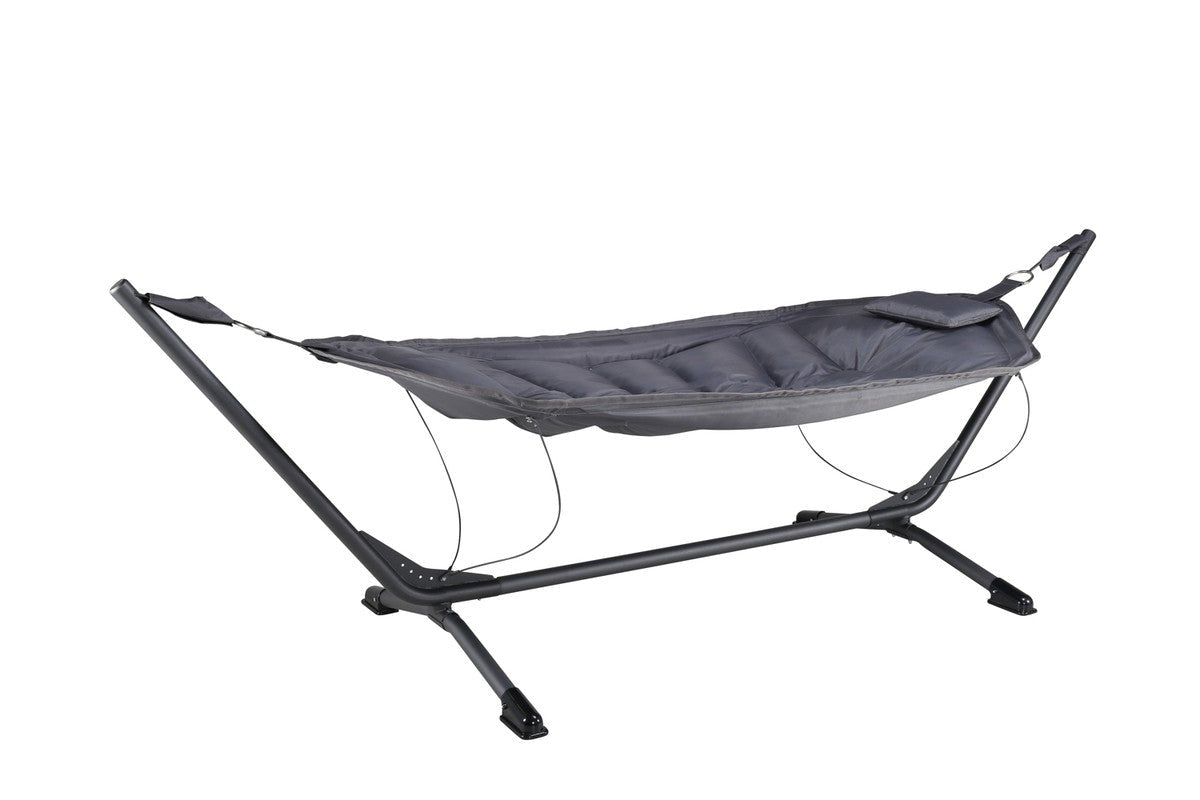 Gun jezelf ultieme ontspanning met de Orlando hangmat! Perfect voor luie zomerdagen, of je nu lekker een boek leest in de schaduw of geniet van de zon. De hangmat is gemaakt van duurzaam grijs polyester, ideaal voor buitengebruik. Dankzij het stevige zwarte stalen frame kun je de hangmat eenvoudig verplaatsen en precies neerzetten waar jij wilt. Laat je gewichtloos meevoeren en ervaar pure rust!