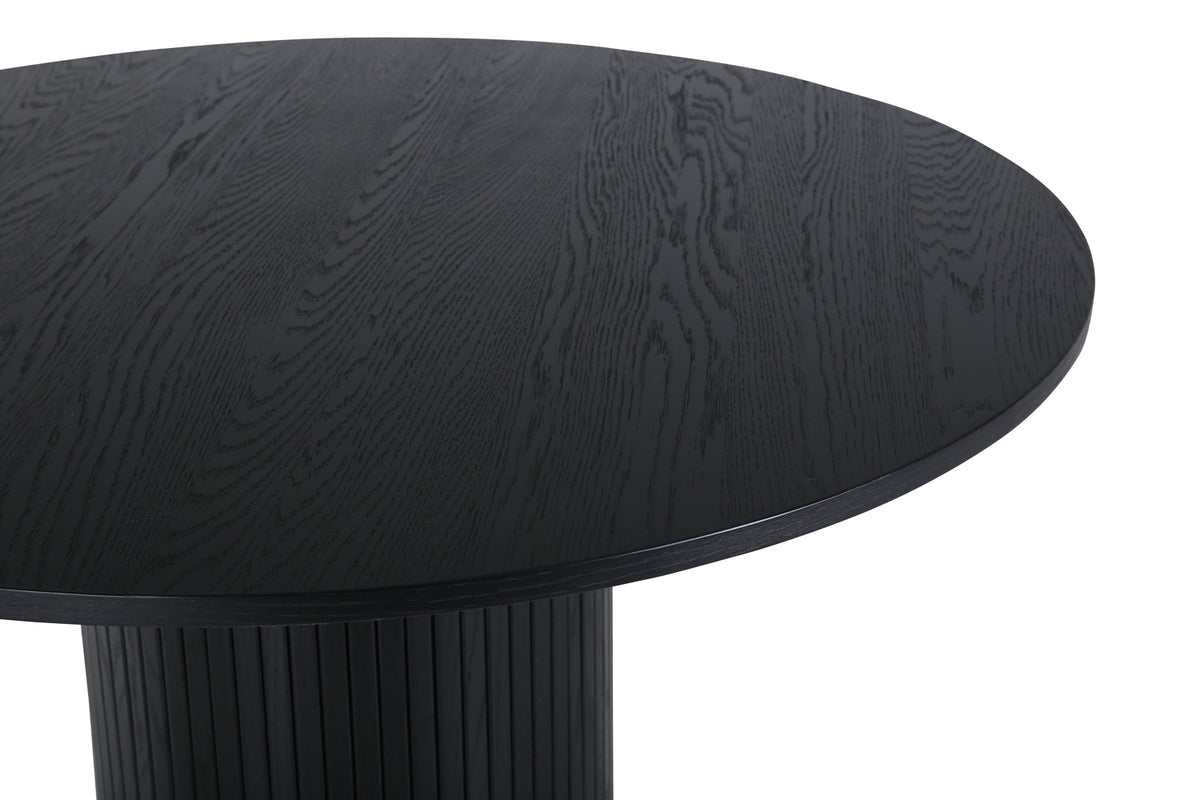 Eetkamertafel Pokka is een echte eyecatcher die indruk maakt! Door de ronde vorm van de tafel zorg je voor een open en warm gevoel in huis. Eetkamertafel Pokka is gemaakt van eiken fineer met een zwarte lak. De kleur is zowel tijdloos als stijlvol en gemakkelijk te combineren met andere decoraties. De cilindrische poot poten heeft een geribbeld patroon en zorgt voor een stevig geheel.