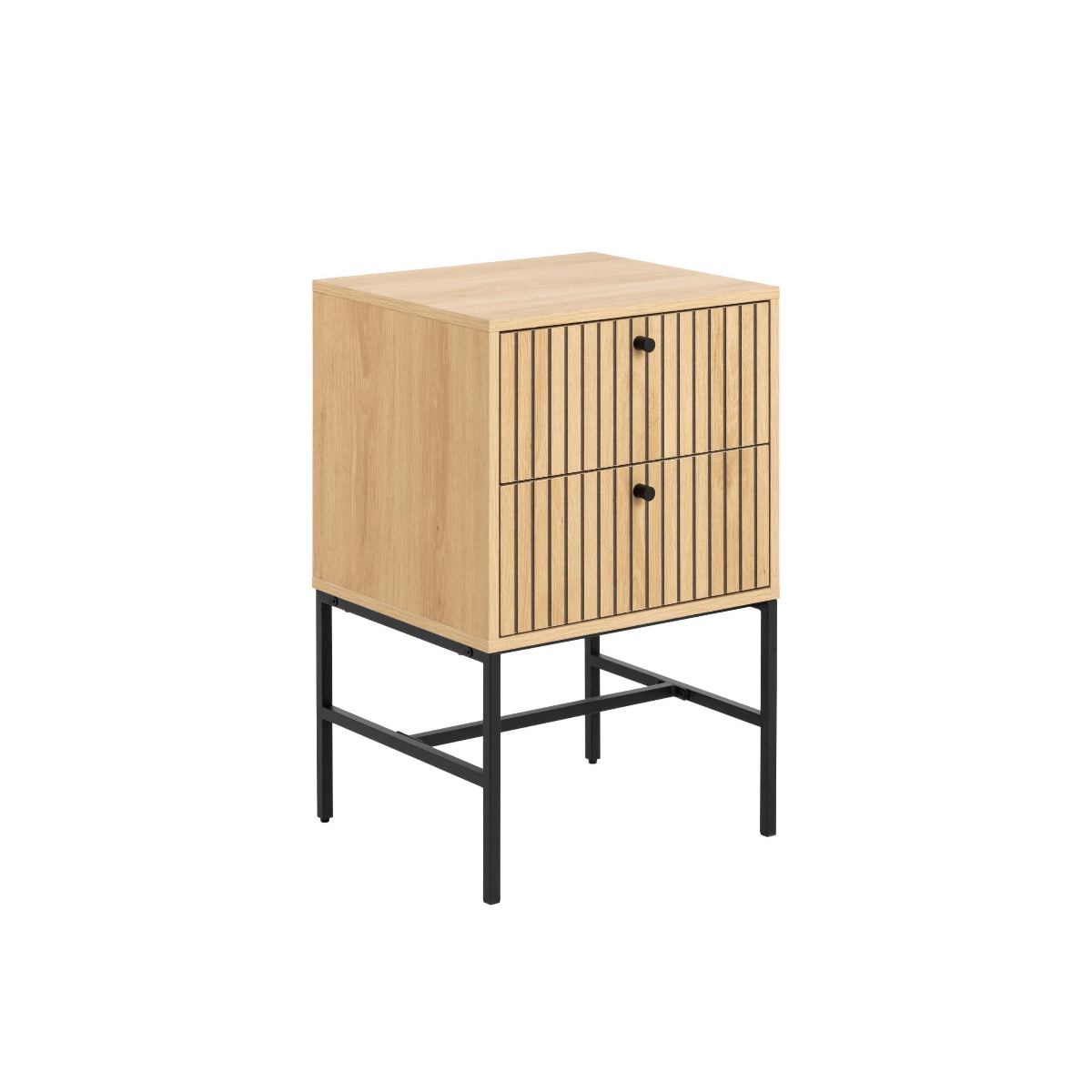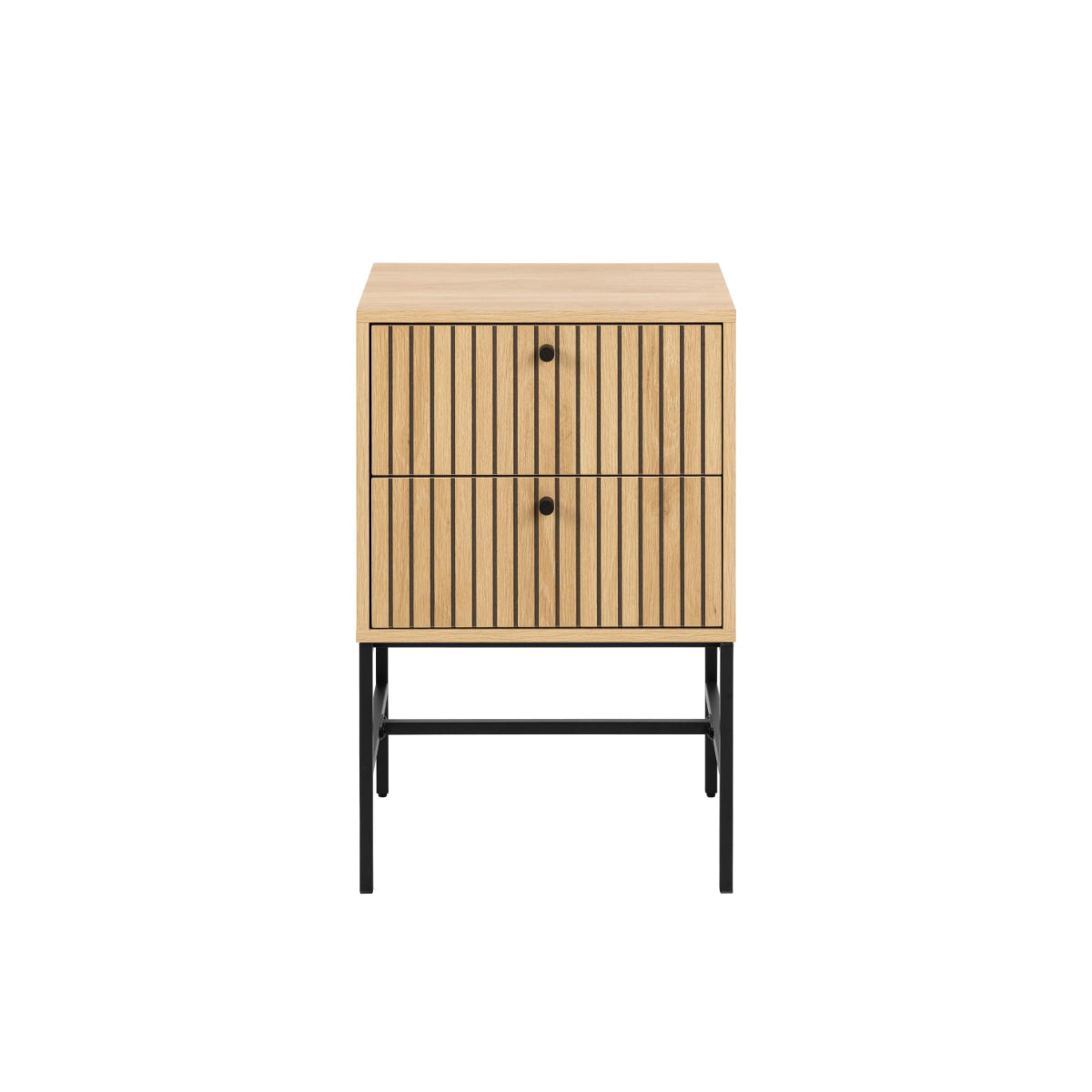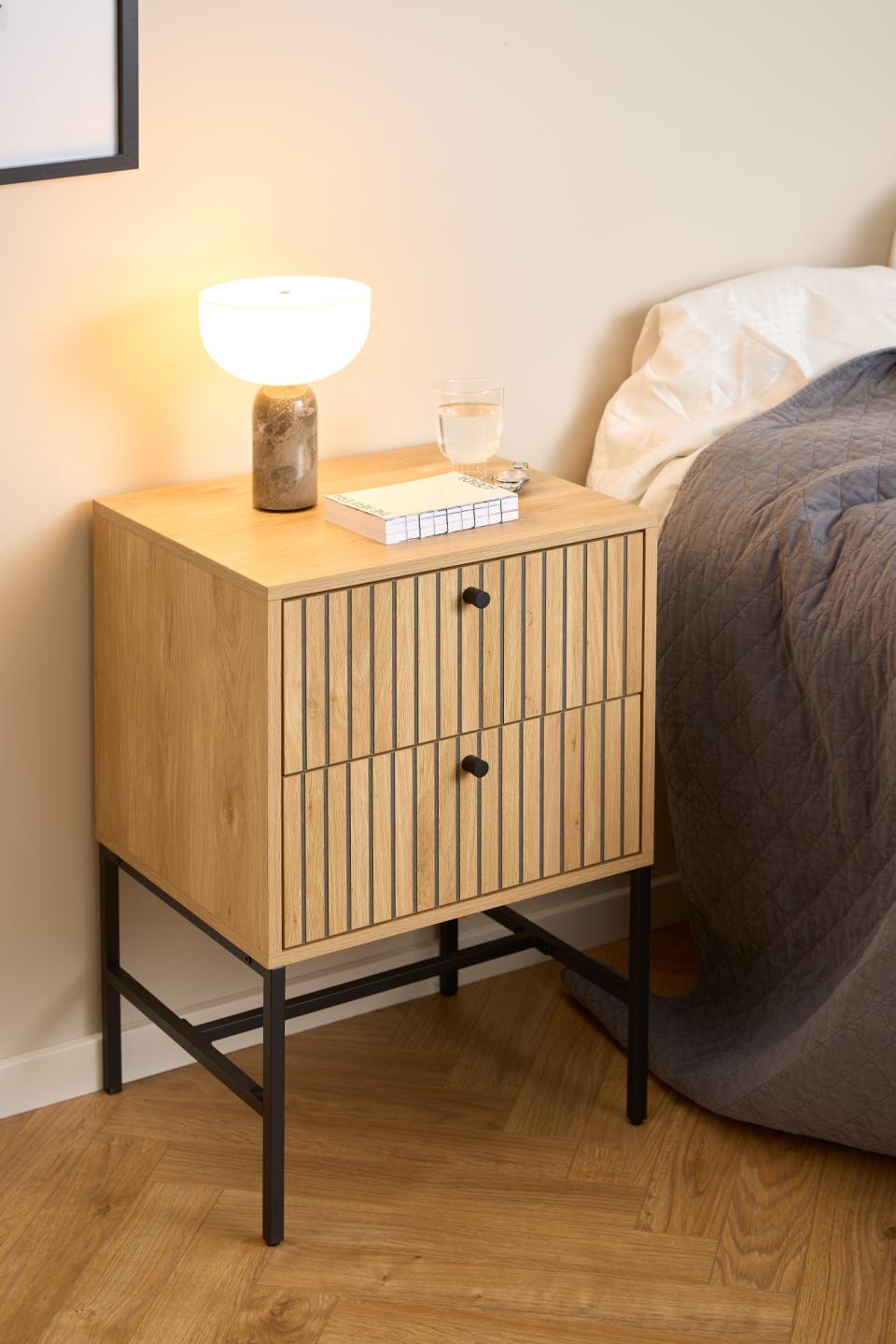 Geef je slaapkamer een upgrade met het Risley nachtkastje! Deze rechthoekige kast met een geometrische basis en lamellenfront, weet precies hoe hij de aandacht trekt. De combinatie van de eikenlook en matte zwarte stalen accenten zorgt voor een strakke uitstraling die in elke stijl past.