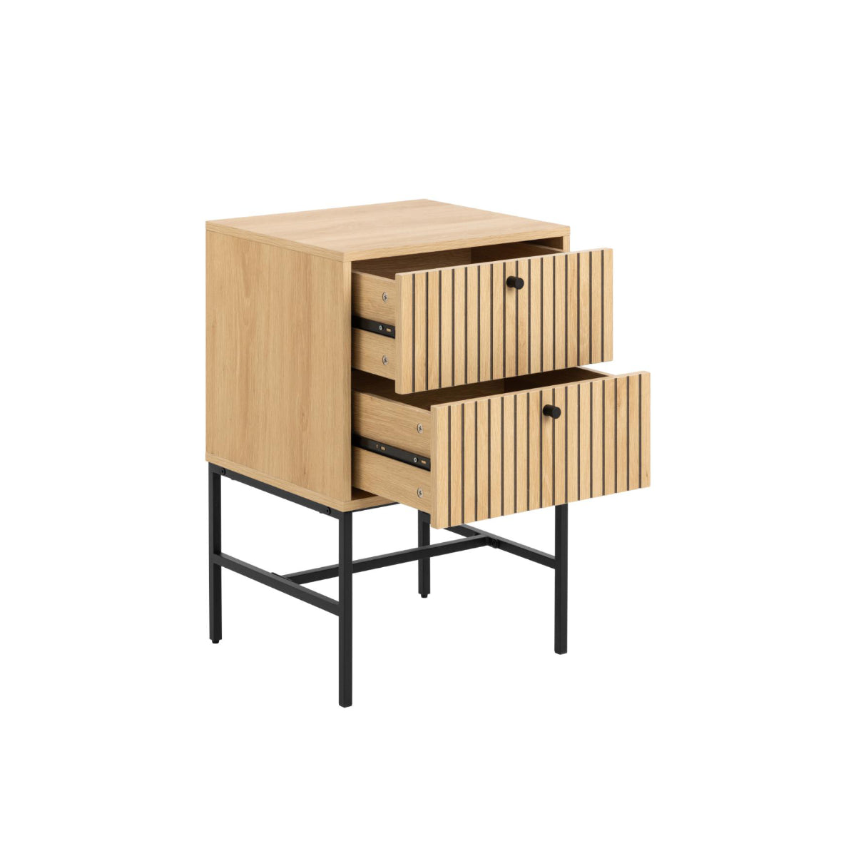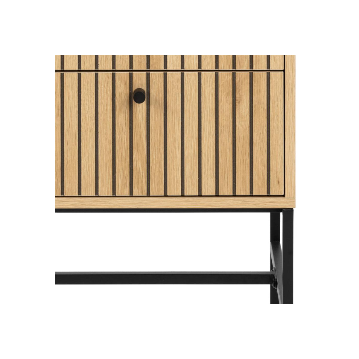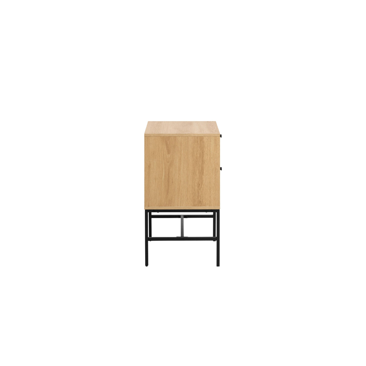 Geef je slaapkamer een upgrade met het Risley nachtkastje! Deze rechthoekige kast met een geometrische basis en lamellenfront, weet precies hoe hij de aandacht trekt. De combinatie van de eikenlook en matte zwarte stalen accenten zorgt voor een strakke uitstraling die in elke stijl past.