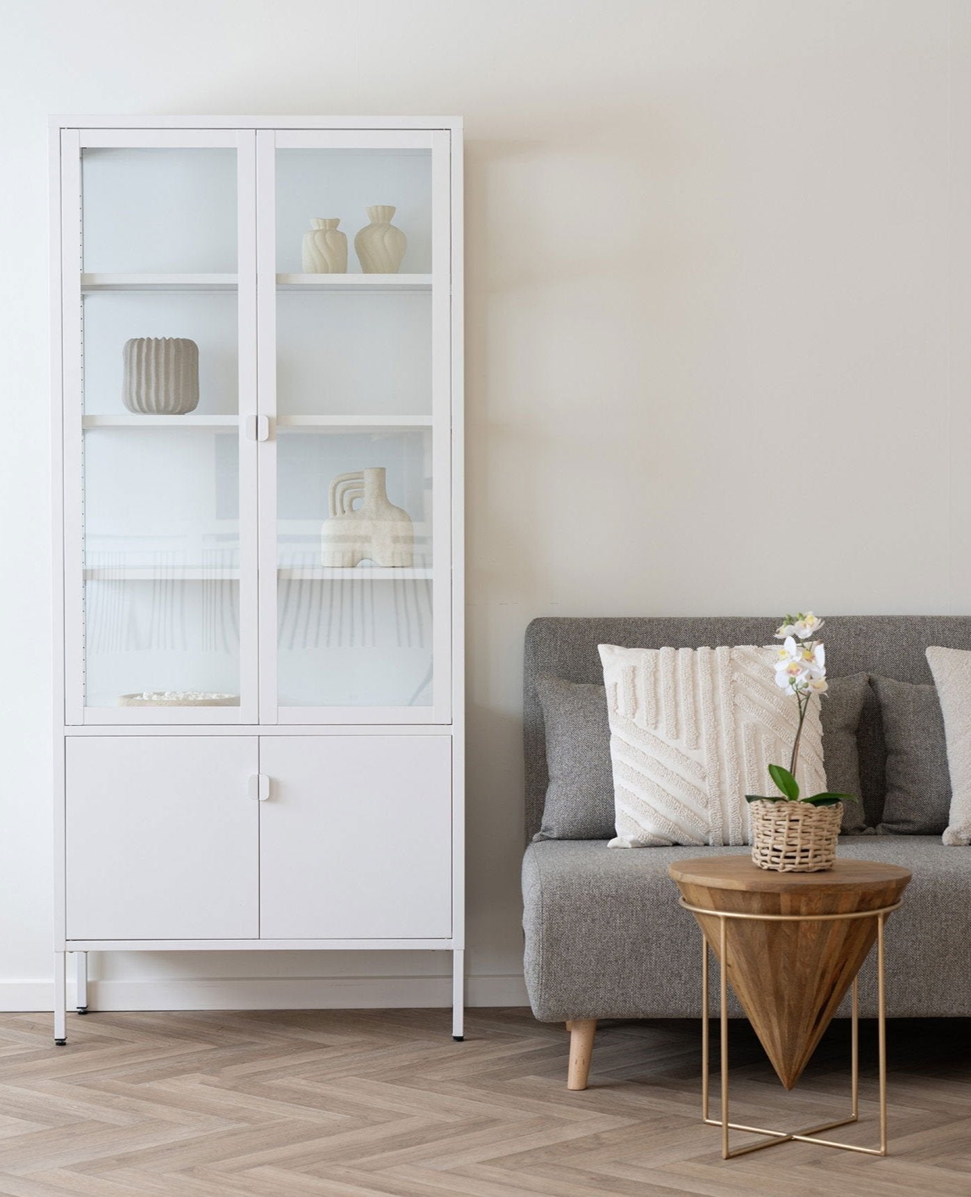 Gemaakt van stevig staal, straalt deze kast een moderne en industriële look uit. De witte metalen poten zorgen voor stabiliteit en geven het geheel een minimalistische uitstraling. De twee dichte deuren bieden een nette en opgeruimde look, terwijl ze je spullen uit het zicht houden en beschermd.