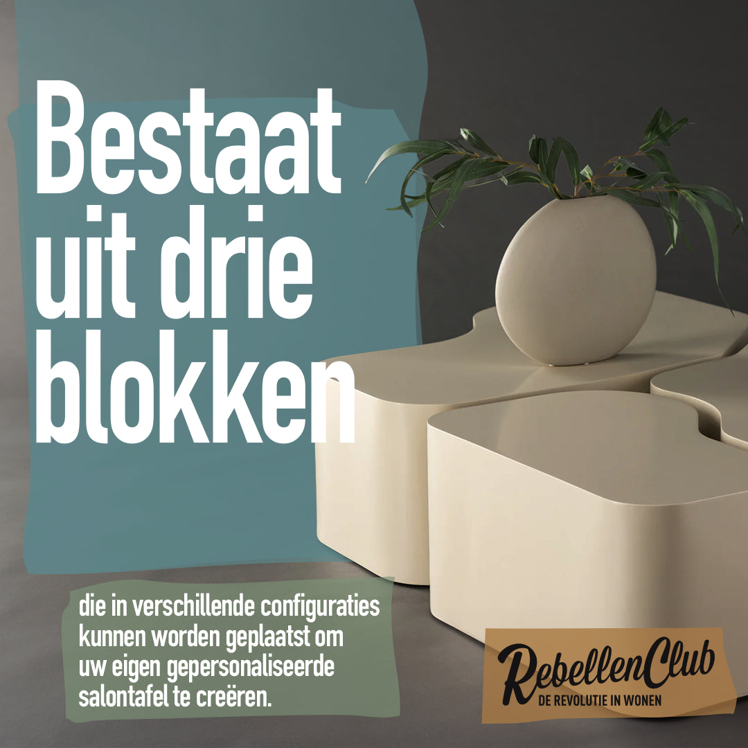 De salontafel is ontworpen in een prachtige beige kleur die een warm en uitnodigend gevoel aan de kamer geeft. Het bestaat uit drie blokken die in verschillende configuraties kunnen worden geplaatst om uw eigen gepersonaliseerde salontafel te creëren. U kunt de blokken eenvoudig verplaatsen om het uiterlijk te veranderen en aan te passen aan uw behoeften en voorkeuren.