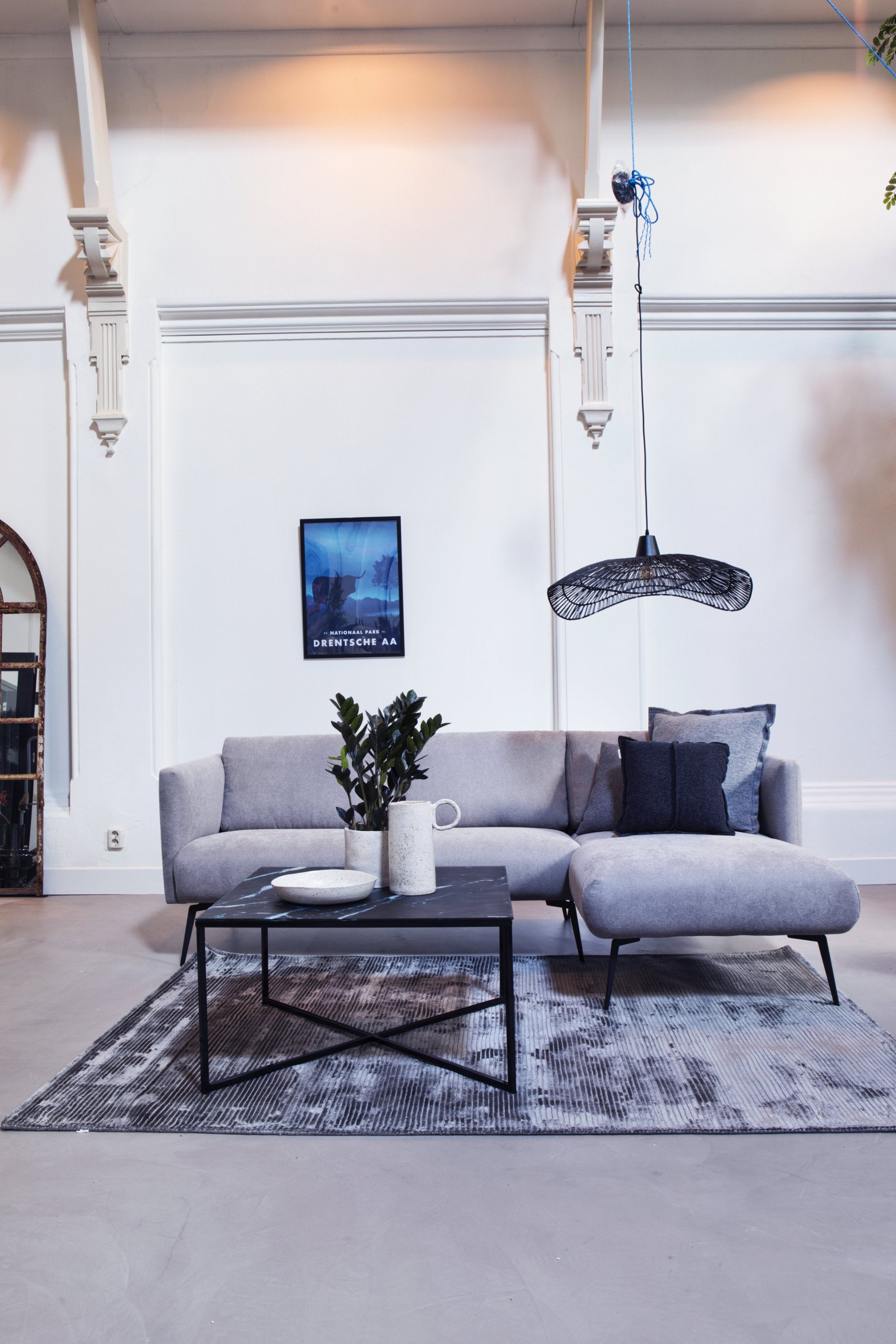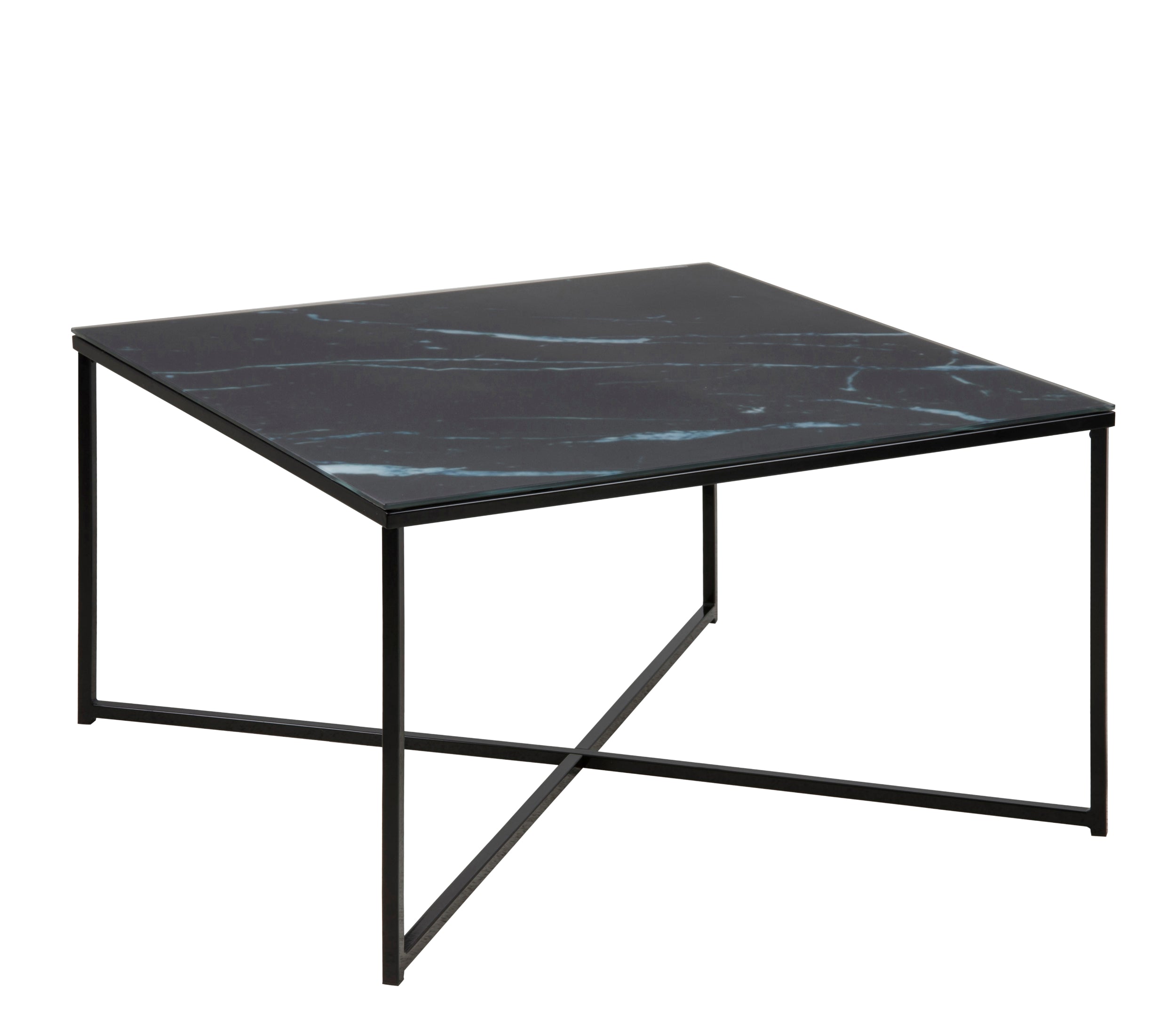en een marmeren print. De tafel is verkrijgbaar in verschillende kleuren en maten. Deze zijn onderling leuk te combineren, zo kun je er ook twee in elkaar vlechten Door te werken met een sprekend zwart metalen onderstel wordt het een grafische tafel. De kruis in het mat zwarte onderstel benadrukt de grafische vormgeving nog eens extra. Je kunt het natuurlijk ook combineren met een andere leuke bijzettafel of een gestoffeerde poef. Dat geeft een speels effect. Het ene tafeltje kan onder het andere geschoven worden. Daarmee kun je dus ook weer ruimte besparen. Het ziet er niet alleen leuk uit, maar is ook nog eens functioneel als je een extra bijzettafel nodig hebt Afmetingen: 80 b x 80 d x 45 h centimeter