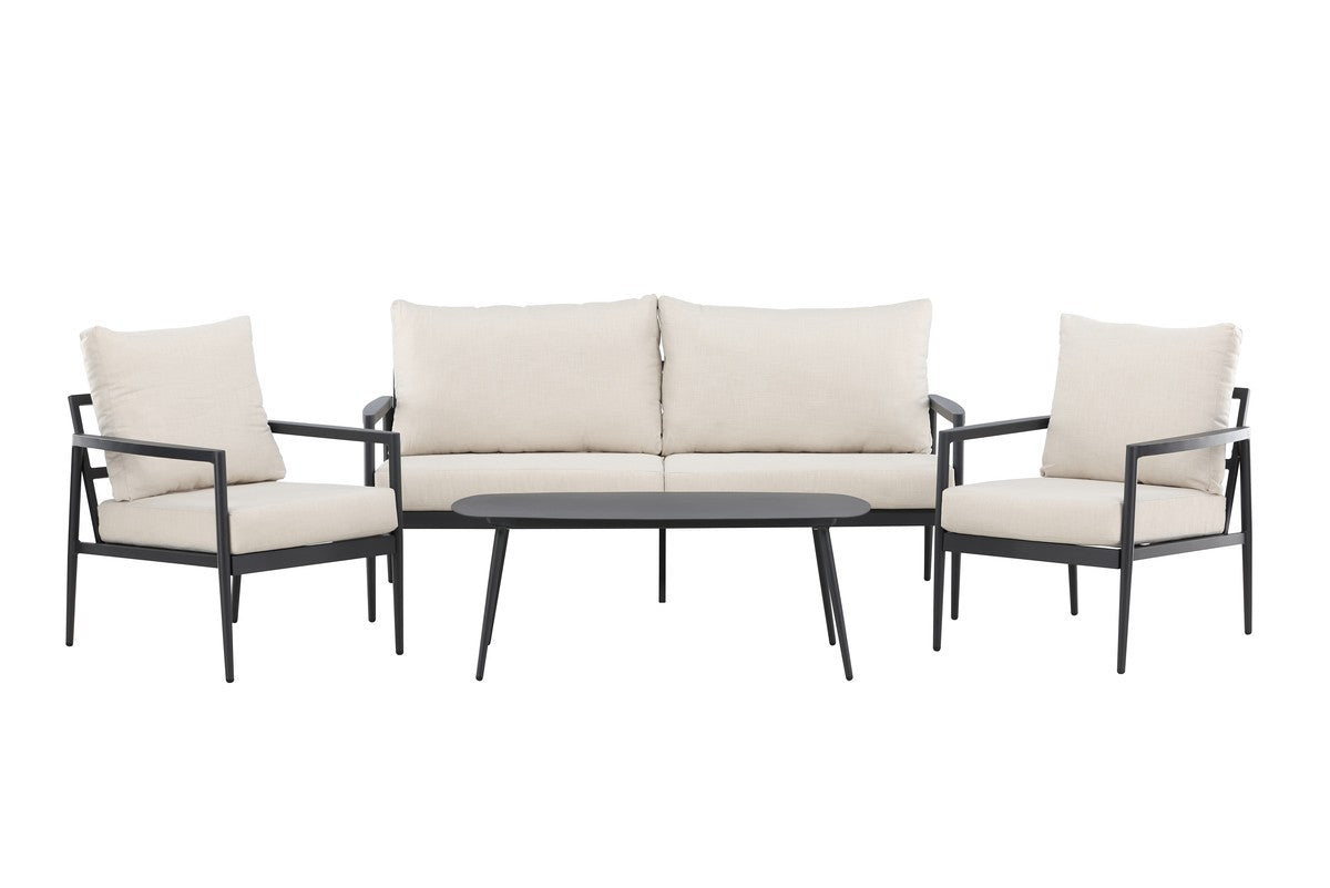 De set bestaat uit een royale sofa, twee comfortabele loungestoelen en een praktisch tafel, perfect voor lange avonden vol gezelligheid. Het tafelblad biedt voldoende ruimte voor hapjes, drankjes of decoratieve accenten, waardoor je moeiteloos een sfeervolle setting creëert.