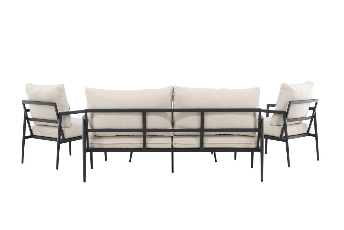 De Sergio loungeset combineert stijl en comfort in een modern design. Met een stevig zwart aluminium frame straalt deze set tijdloze elegantie uit, terwijl de zachte beige kussens van hoogwaardig polyester zorgen voor optimaal zitcomfort.