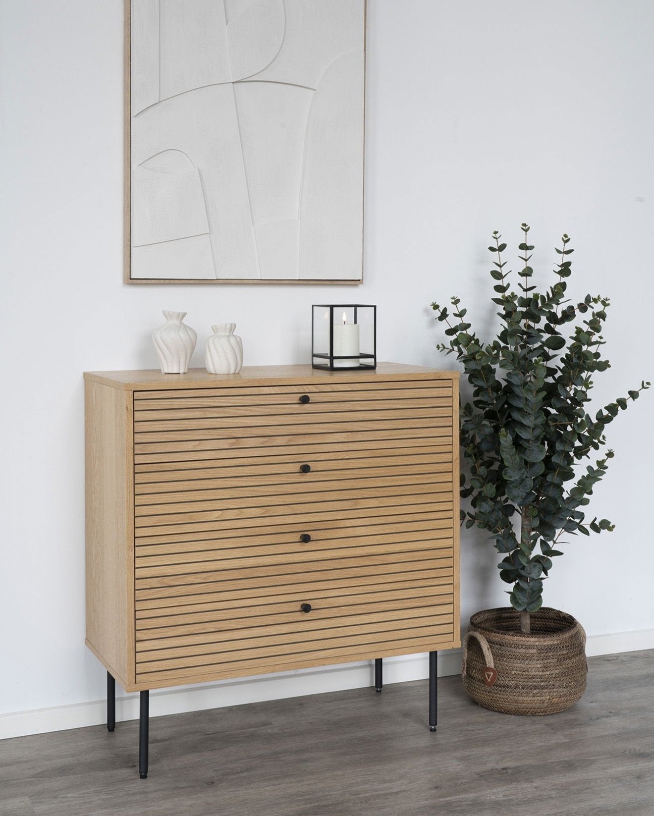 Met afmetingen van 80x40x85 cm biedt de Tofino ladekast veel opbergruimte in de vier lades. Het is perfect voor het opbergen van kleding, accessoires of andere spullen. Het design met de strakke houten latjes en het zwarte frame maakt het gemakkelijk om deze kast in verschillende stijlen toe te passen, of je nu een klassieke of moderne look hebt.
