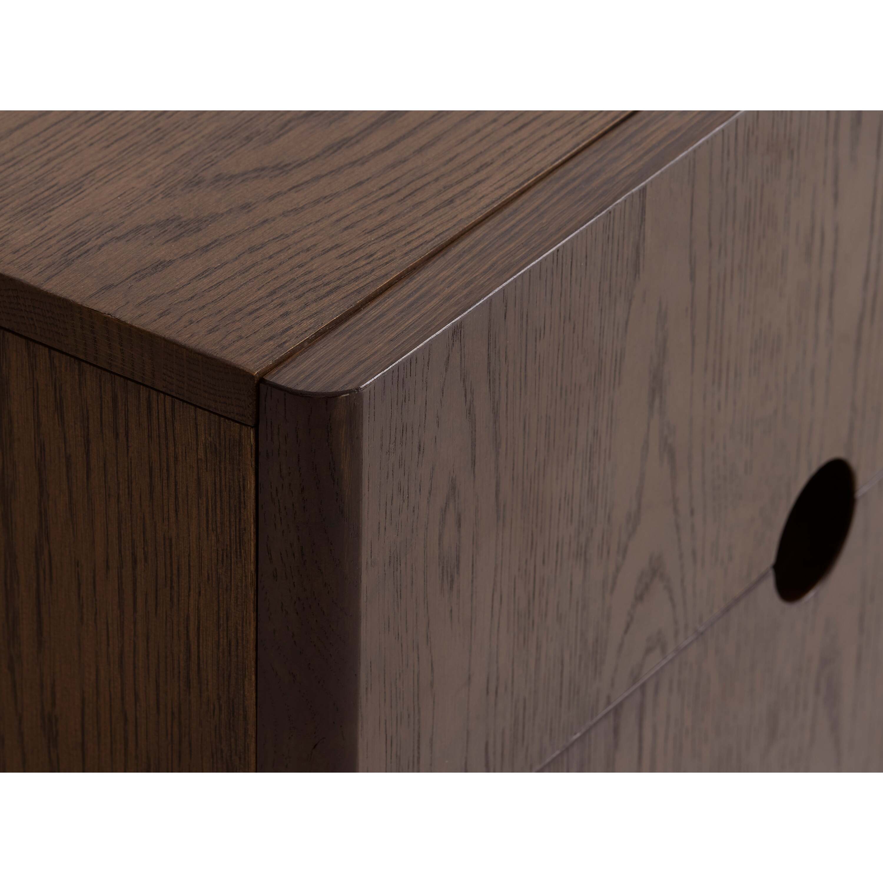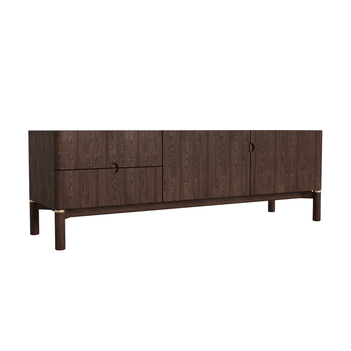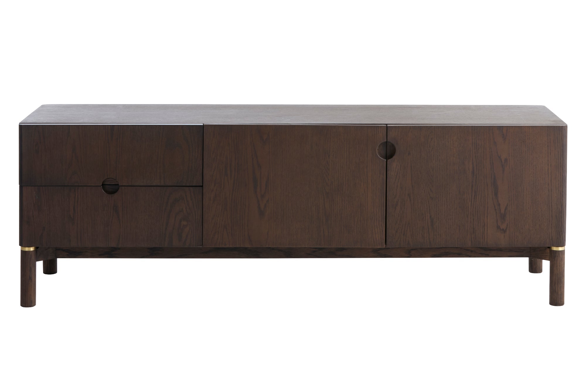 Gemaakt van donkerbruin hout met een warme nerftekening en subtiele messing accenten aan de poten. De afgeronde hoeken en ronde handgrepen geven het meubel een zachte, moderne uitstraling. Een tijdloos ontwerp dat perfect past in een sfeervol interieur.