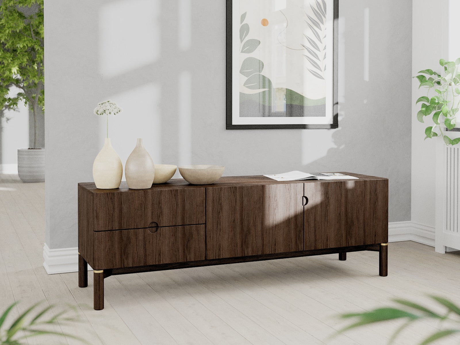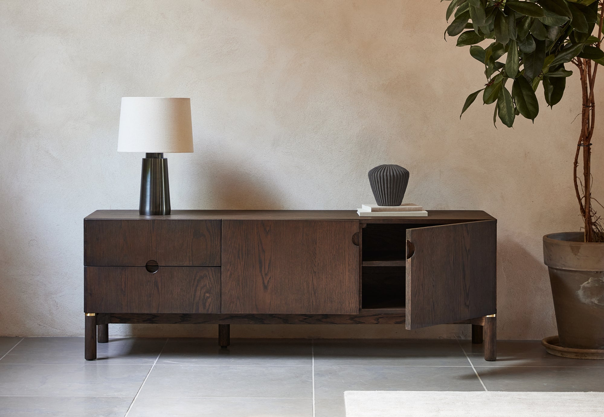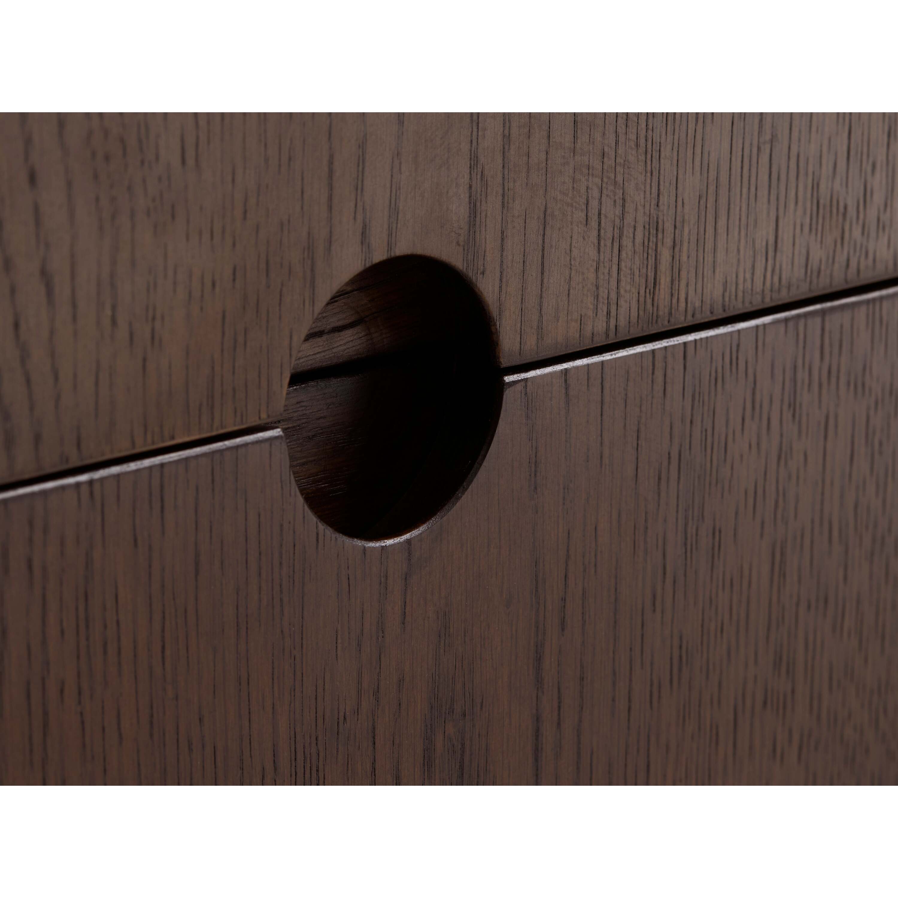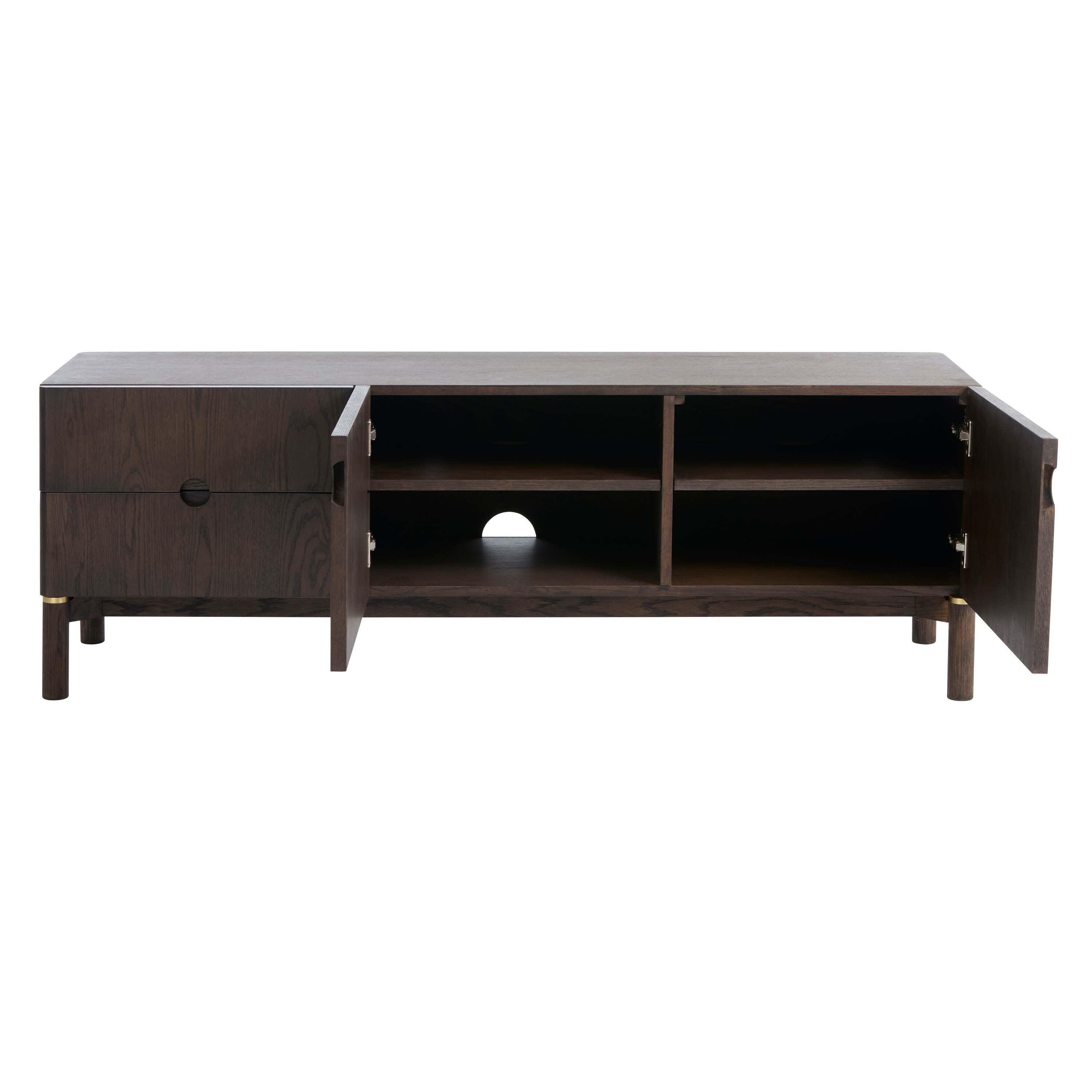Gemaakt van donkerbruin hout met een warme nerftekening en subtiele messing accenten aan de poten. De afgeronde hoeken en ronde handgrepen geven het meubel een zachte, moderne uitstraling. Een tijdloos ontwerp dat perfect past in een sfeervol interieur.