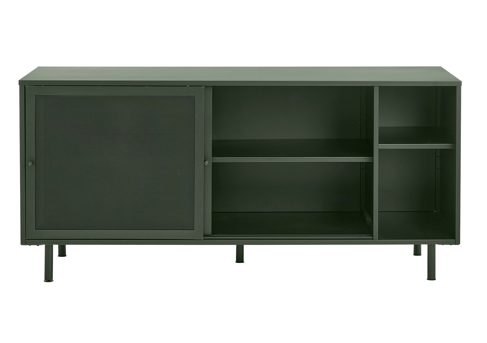 Aan de linkerkant van het dressoir bevinden zich twee schuifdeuren met daarachter een stevige plank. Deze ruimte is ideaal voor het netjes opbergen van grotere items zoals servies, tafellinnen of huishoudelijke benodigdheden. Aan de rechterkant zijn er nog twee open vakken, perfect voor het uitstallen van decoratieve objecten, boeken of voor het eenvoudig toegankelijk houden van alledaagse voorwerpen.