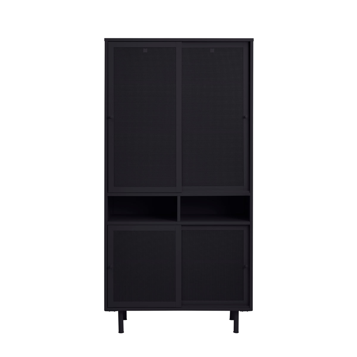 De kast heeft twee x twee schuifdeuren met gaas, wat niet alleen voor een stijlvolle uitstraling zorgt, maar je ook in staat stelt om een glimp op te vangen van wat er binnenin wordt opgeborgen. Achter de schuifdeuren bevinden zich drie stevige planken, ideaal voor het organiseren van servies, boeken of decoratieve items. In het midden van de schuifdeuren zijn er nog twee open vakken, perfect voor het uitstallen van je favoriete accessoires of het snel opbergen van alledaagse voorwerpen.