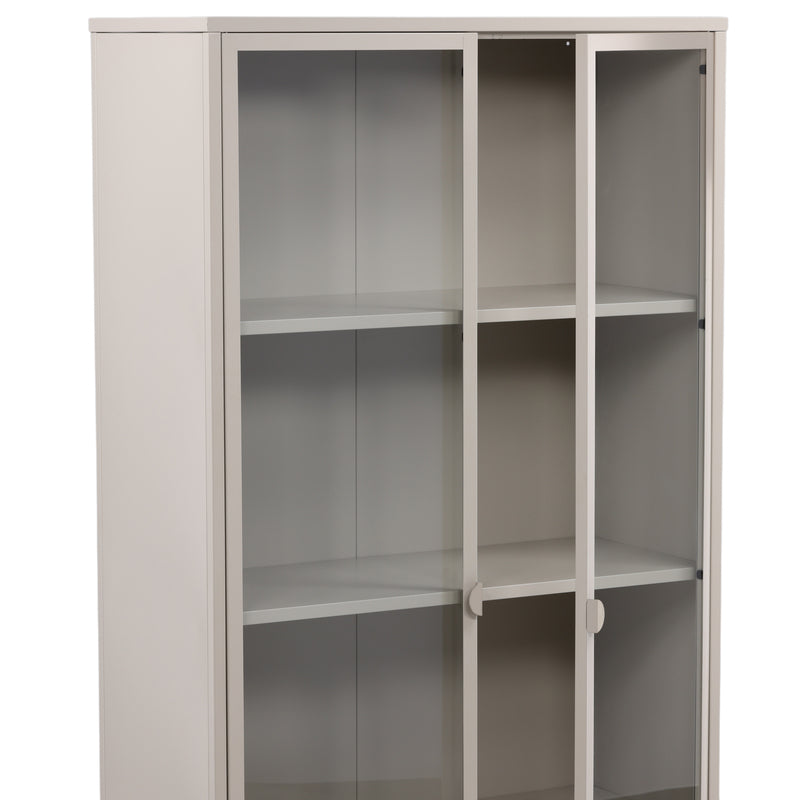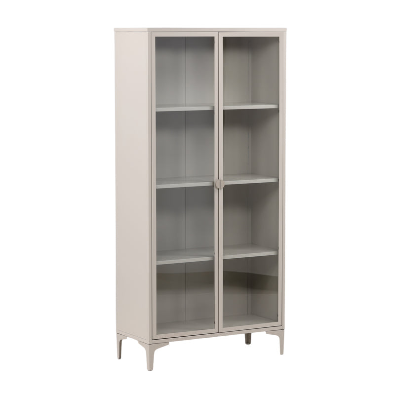 Vitrinekast Bagn is een populaire toevoeging aan het interieur met elegante opbergfaciliteiten! De vitrinekast heeft een moderne ontwerp met rechte structuren, gemaakt van gepoedercoat beige staal. De kast heeft twee hoge glazen deuren die mooi lichtinval bieden in de kast. Vitrinekast Bagn beschikt over drie planken voor je mooiste accessoires.
