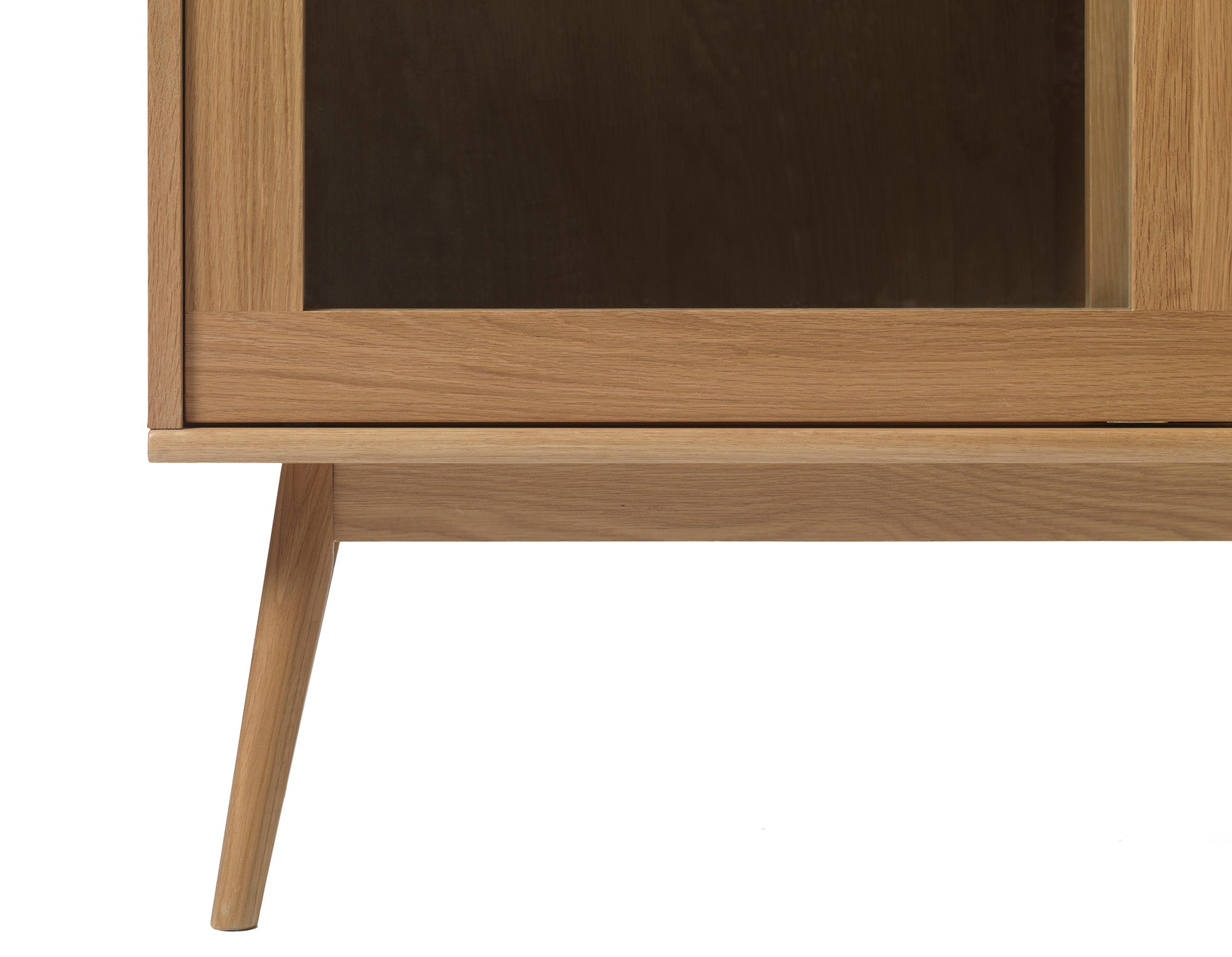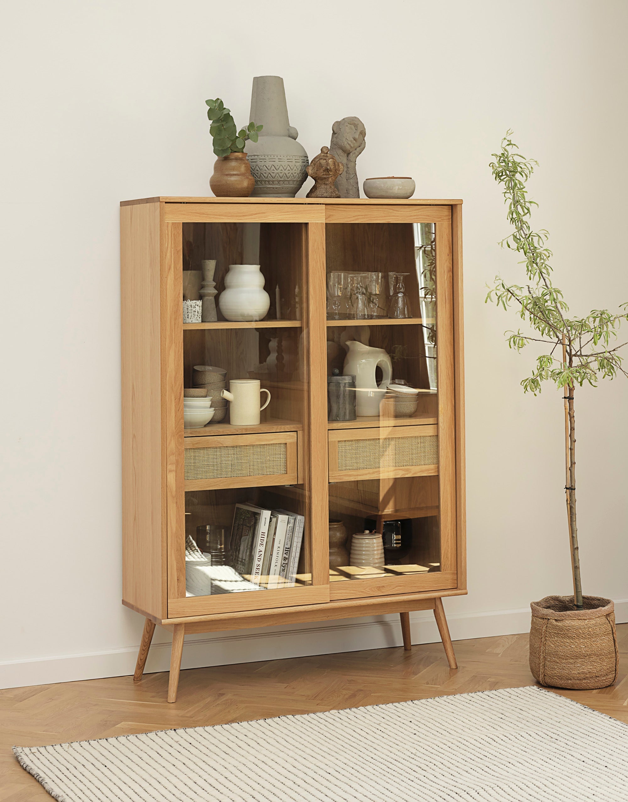 Deze combinatie van glazen deuren en rattan details maakt de Yass Vitrinekast een perfecte keuze voor iedereen die op zoek is naar zowel een esthetisch aantrekkelijke als praktische opbergoplossing. Gemaakt van hoogwaardig eikenhout en eikenfineer, straalt de kast een natuurlijke charme uit die moeiteloos past bij diverse interieurstijlen.