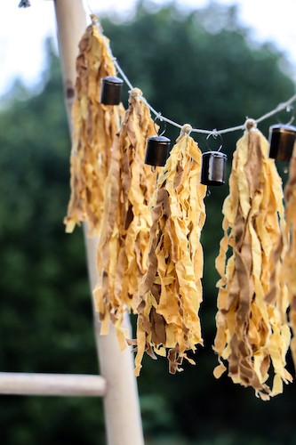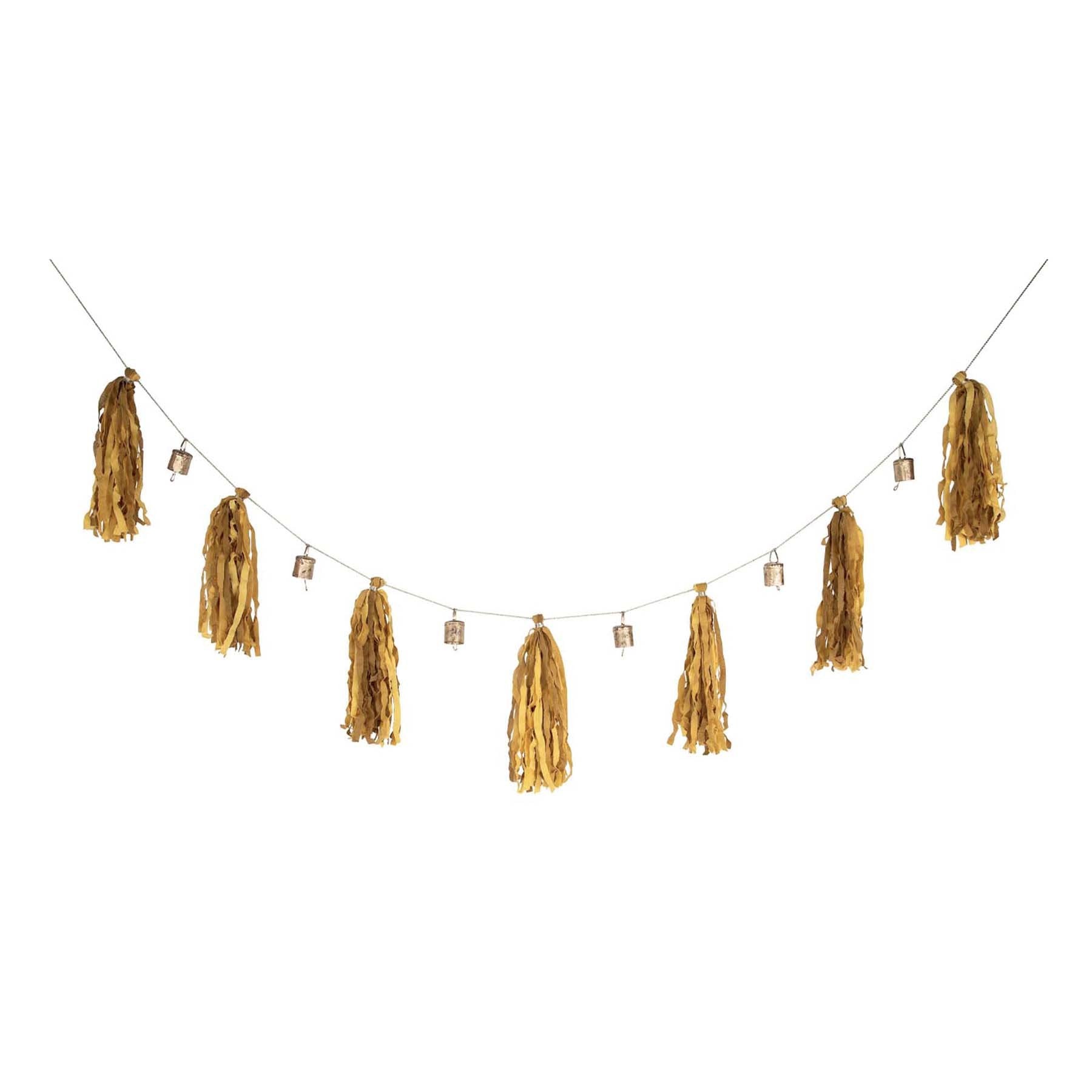 Deze vier-het-leven bohemian slinger, in okergeel, gemaakt van gerecycled katoen en belletjes is een gezellige aankleding in je interieur of in de tuin. Als de belletjes in de wind rinkelen komen je wensen uit. ...
