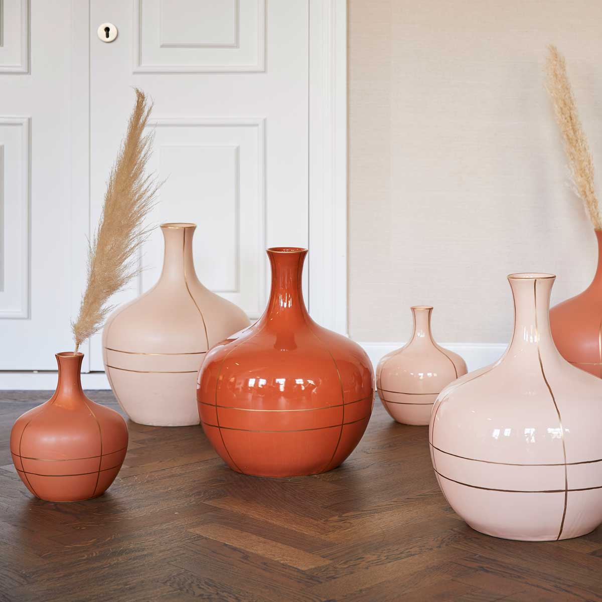Suus is een unieke vaas die niets extra's nodig heeft om opgemerkt te worden. De matte tint brique rood gecombineerd met het handgeschilderde samenspel van gouden lijnen zorgen voor een elegant effect. Voeg voor een extra touch een paar mooie takken of gedroogde bloemen toe. Tip: aangezien de vaas van aardewerk is gemaakt, raden we je aan om voorzichtig met water om te gaan, ook al is de binnenkant bekleed met een waterdichte coating. Aardewerk is niet 100% gegarandeerd waterdicht.| Materiaal: | keramiek |