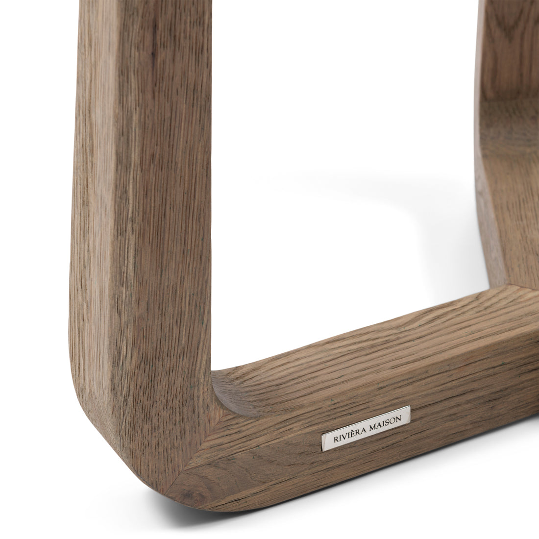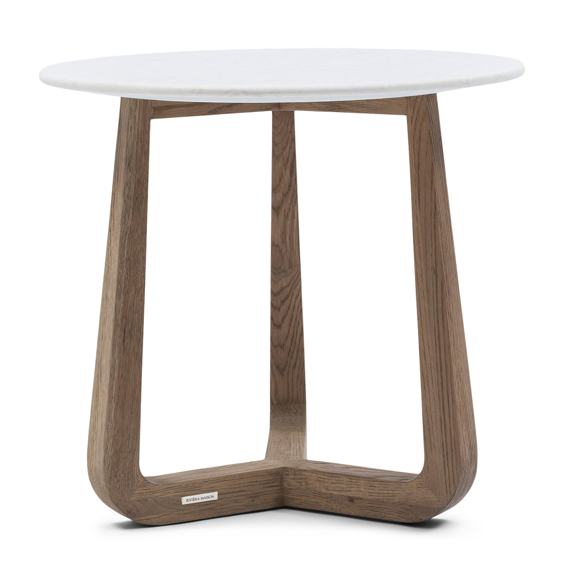 - Deze bijzettafel is werkelijk uniek. Het ronde marmeren blad voegt een luxe uitstraling toe, terwijl de drie eikenhouten poten in een modern ontwerp samenkomen. Het subtiele Rivièra Maison-logo op de poot accentueert de verfijning van het geheel. Elke tafel is uniek door de natuursteen, waardoor je altijd een one-of-a-kind stuk in je interieur hebt. Perfect voor een stijlvolle en eigentijdse touch.