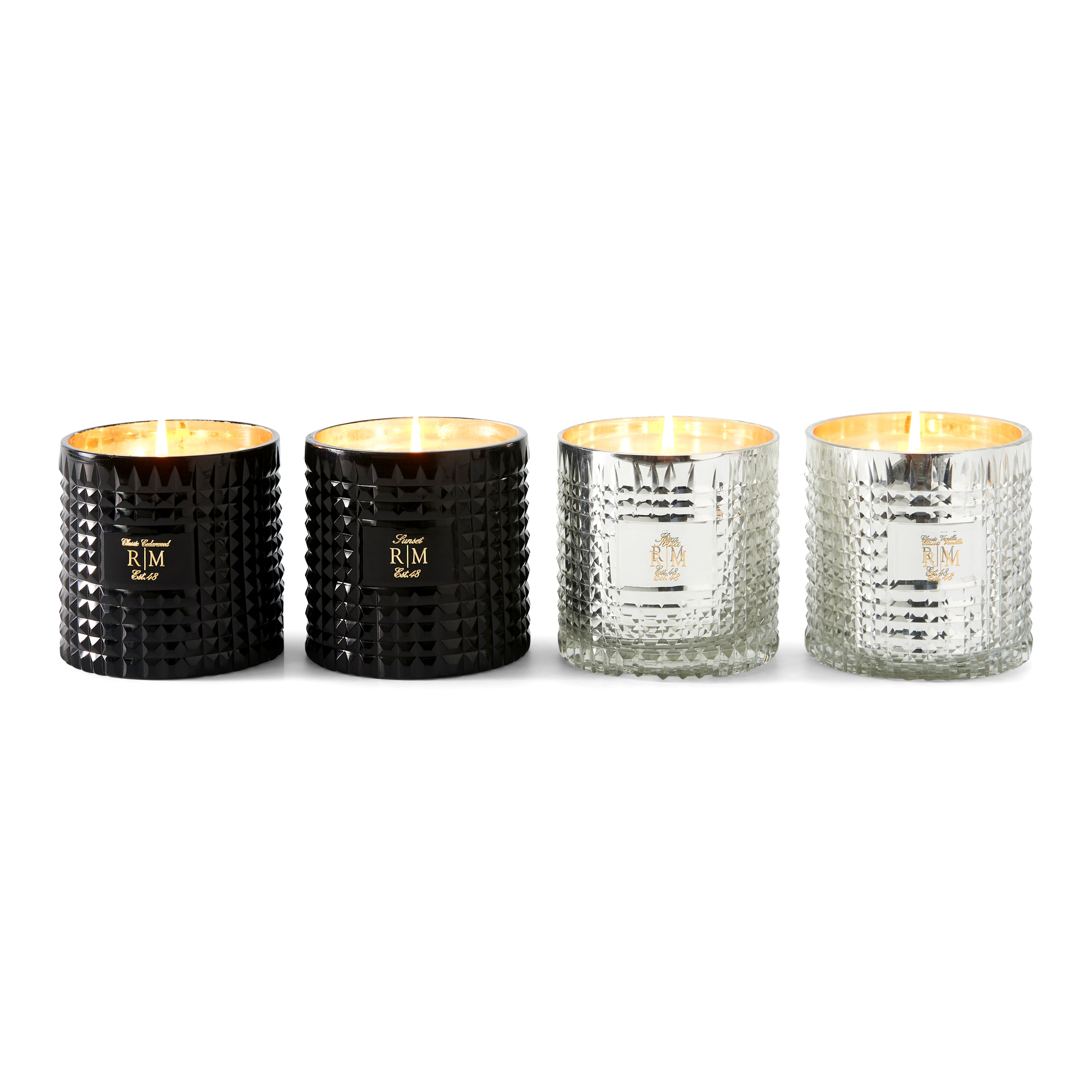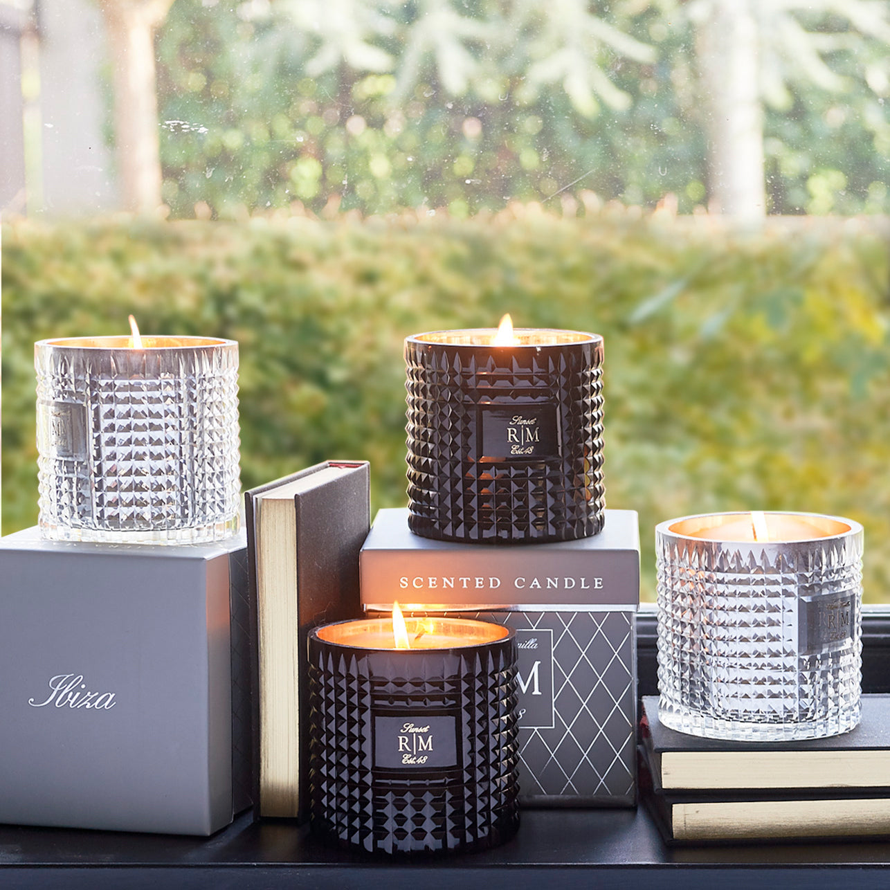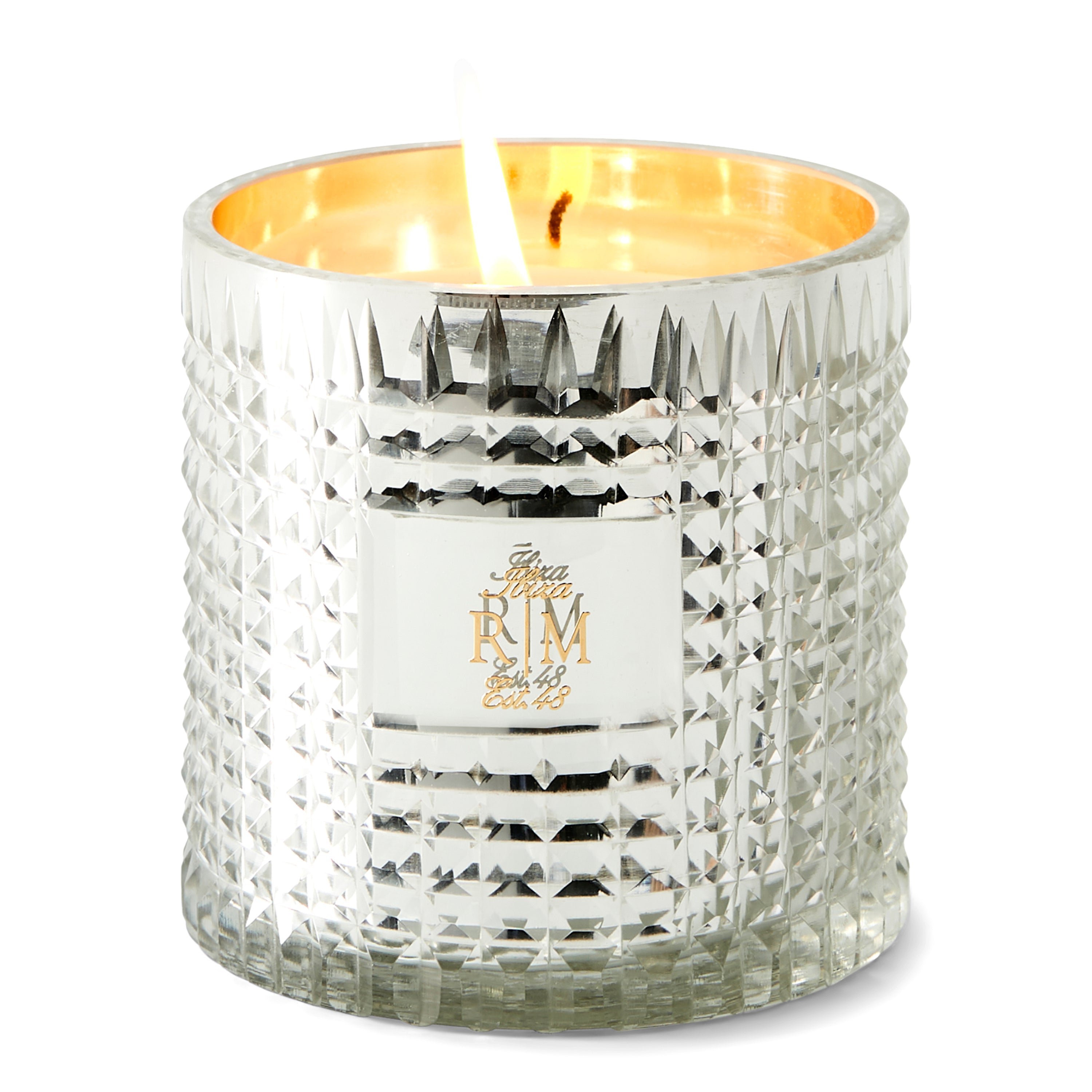 - De glazen houder is volledig bedekt met spiegelende facetten