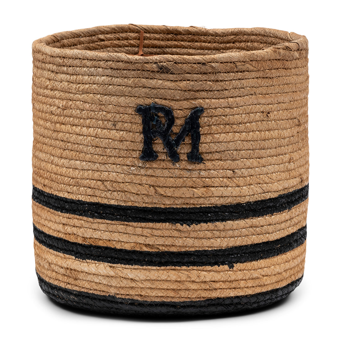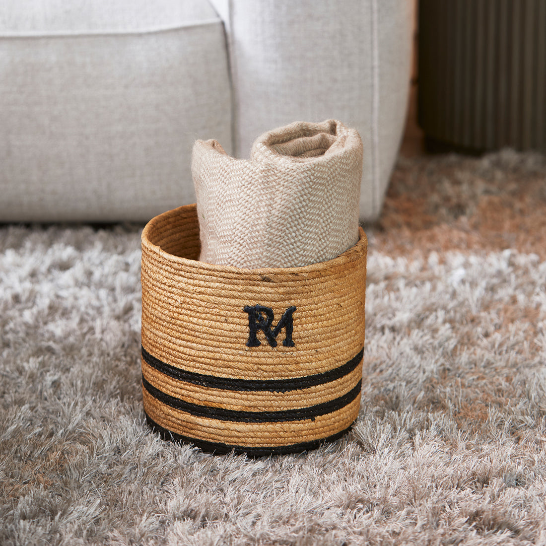 - Een prachtig geweven mandje, verfijnd met zwarte accenten en het RM-logo, ideaal voor het opbergen van kleine voorwerpen. Combineer met de grotere variant voor een harmonieus opgeruimd interieur.
