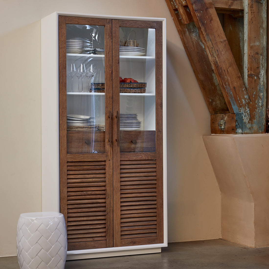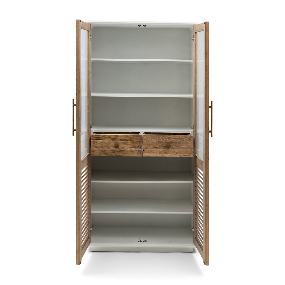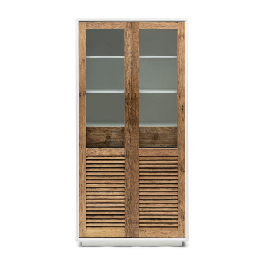 - De Lake buffetkast is een elegante aanvulling op je interieur, met houten deuren die een warme touch toevoegen. De deuren zijn voorzien van louvre en glas, wat een verfijnde en luchtige uitstraling creëert. De gouden handgrepen voegen een stoer accent toe, terwijl de magneetsluiting zorgt voor een naadloze en praktische afwerking. Met twee lades biedt deze kast ook handige opbergruimte, waardoor de kast zowel functioneel als stijlvol is. Elk kast is uniek door het gebruik van teruggewonnen eikenhout.