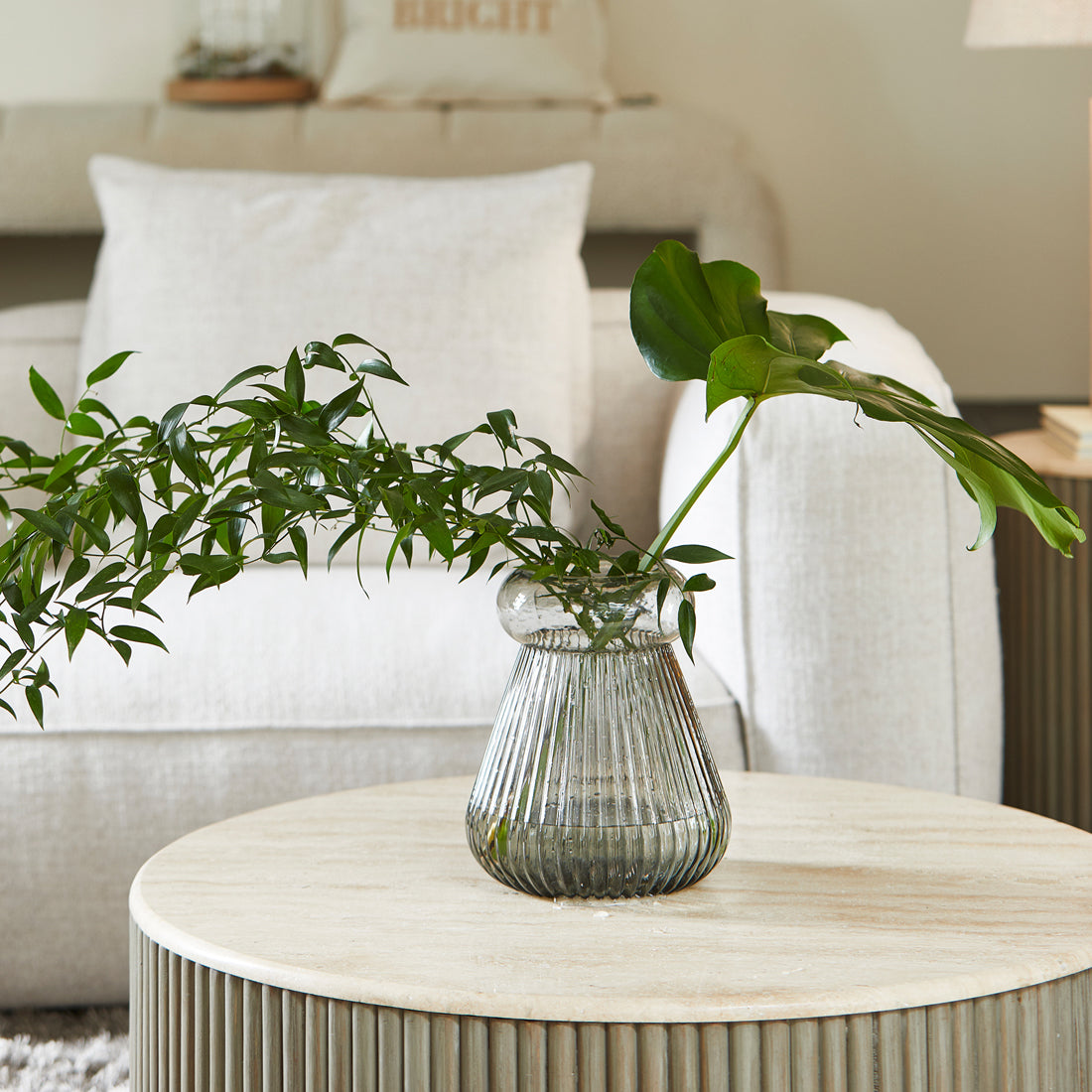 - Deze unieke vaas, vervaardigd uit geribbeld glas en voorzien van een brede, rondlopende hals, biedt een verfijnde en moderne uitstraling. Het bijzondere ontwerp maakt het een schitterende keuze voor het tonen van een prachtige bos bloemen of stijlvolle decoratieve takken. De vaas voegt een luxe en eigentijdse sfeer toe aan je interieur, terwijl het geribbelde glas een speelse, maar toch elegante textuur biedt.