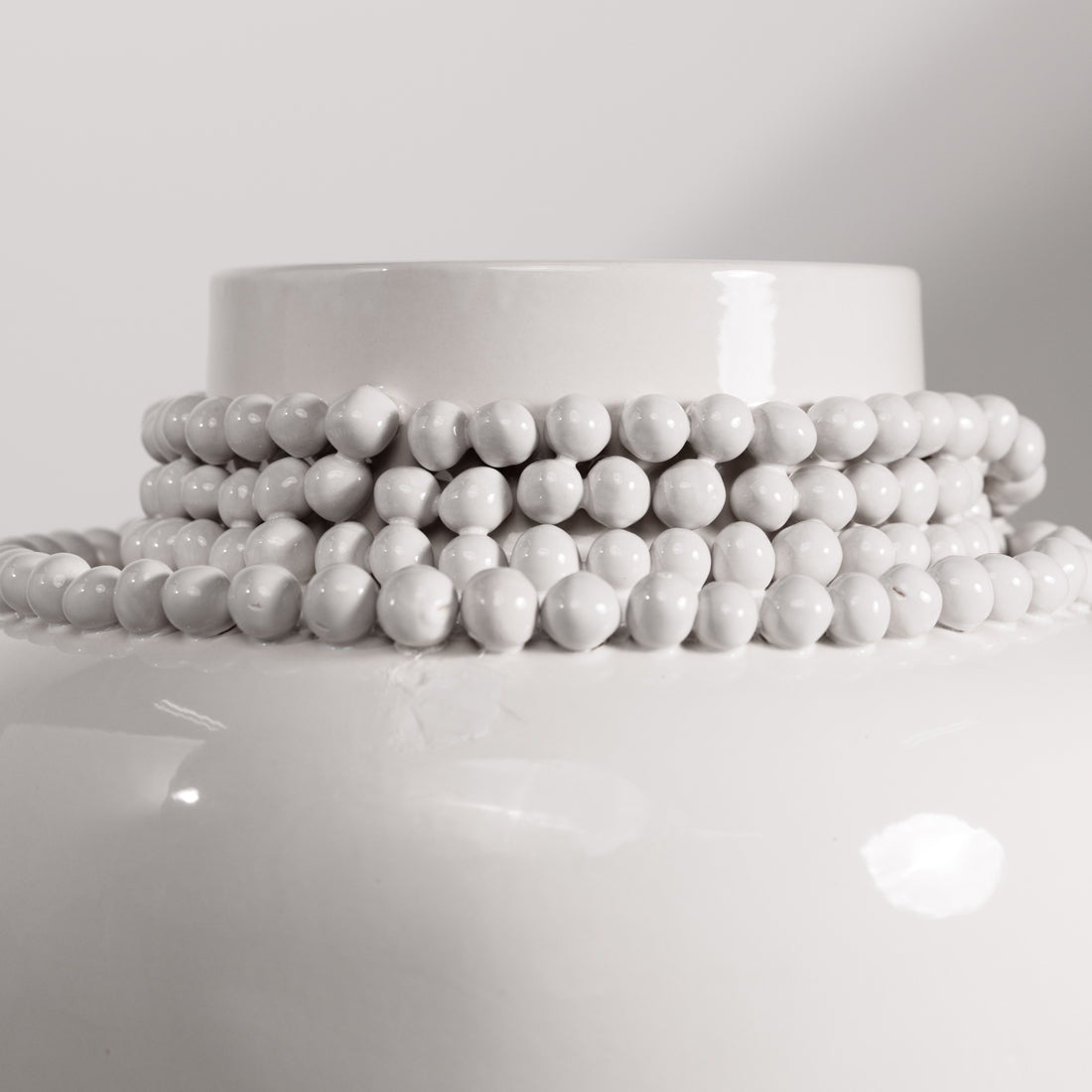 - Deze keramische vaas met een breed ontwerp en een hals die doet denken aan een parelketting, is een prachtige combinatie van elegantie en moderne flair. Elk stuk is met de hand gemaakt door vakmensen met meer dan 30 jaar ervaring. De vaas wordt zorgvuldig op de draaischijf gevormd, met de hand bewerkt en afgewerkt met glazuur.Het proces begint met het draaien van de klei op de pottenbakkersschijf, gevolgd door het zorgvuldig sculpturen van de kralen, wat ongeveer 5-10 minuten per detail kost. Een artisanale werker kan ongeveer 5-6 vazen per dag boetseren, waarbij elke vaas 1 tot 2 uur duurt om te vormen. Na het boetseren ondergaat de vaas een droogproces en wordt deze in de oven geglazuurd. Deze unieke vaas voegt verfijning en stijl toe aan elk interieur, met een tijdloze aantrekkingskracht en een gedetailleerd vakmanschap.