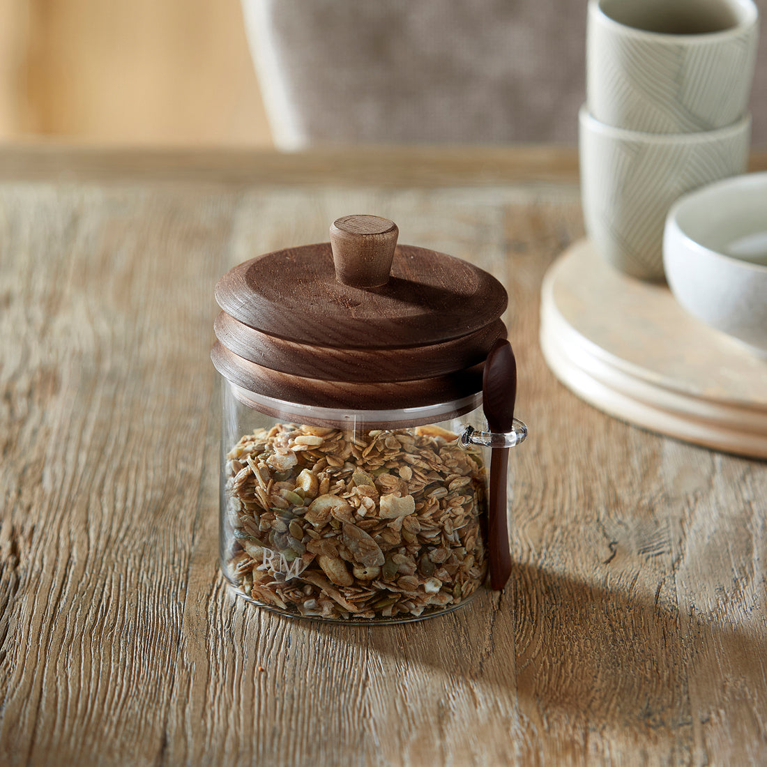 - Een stijlvolle manier van opbergen – Deze opslagpot combineert prachtig transparant glas met een houten deksel, ideaal voor het stijlvol bewaren van kruiden en andere ingrediënten in jouw keuken.