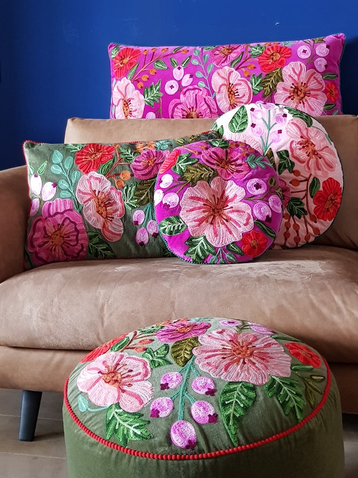 Dit kussen is zo mooi gemaakt, je hele bank fleur er van op! Prachtig cotton velvet kussen, in een lekkere knalroze kleur met handgborduurd motief van roze, rode en lila bloemen met groene bladeren. Het kussen is rondom afgezet met groene pompoms. Heel leuk als opvallend statement op je bank of stoel! Dit is een fair trade kussen, dat met de hand geborduurd is in India.