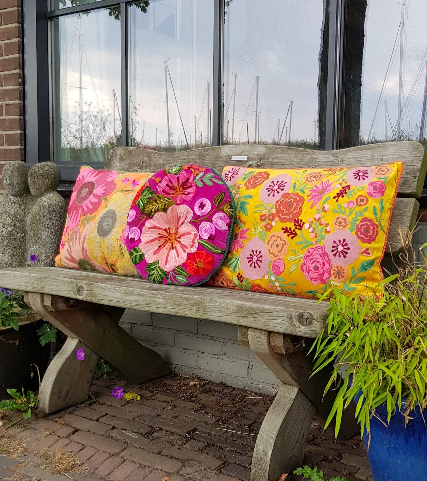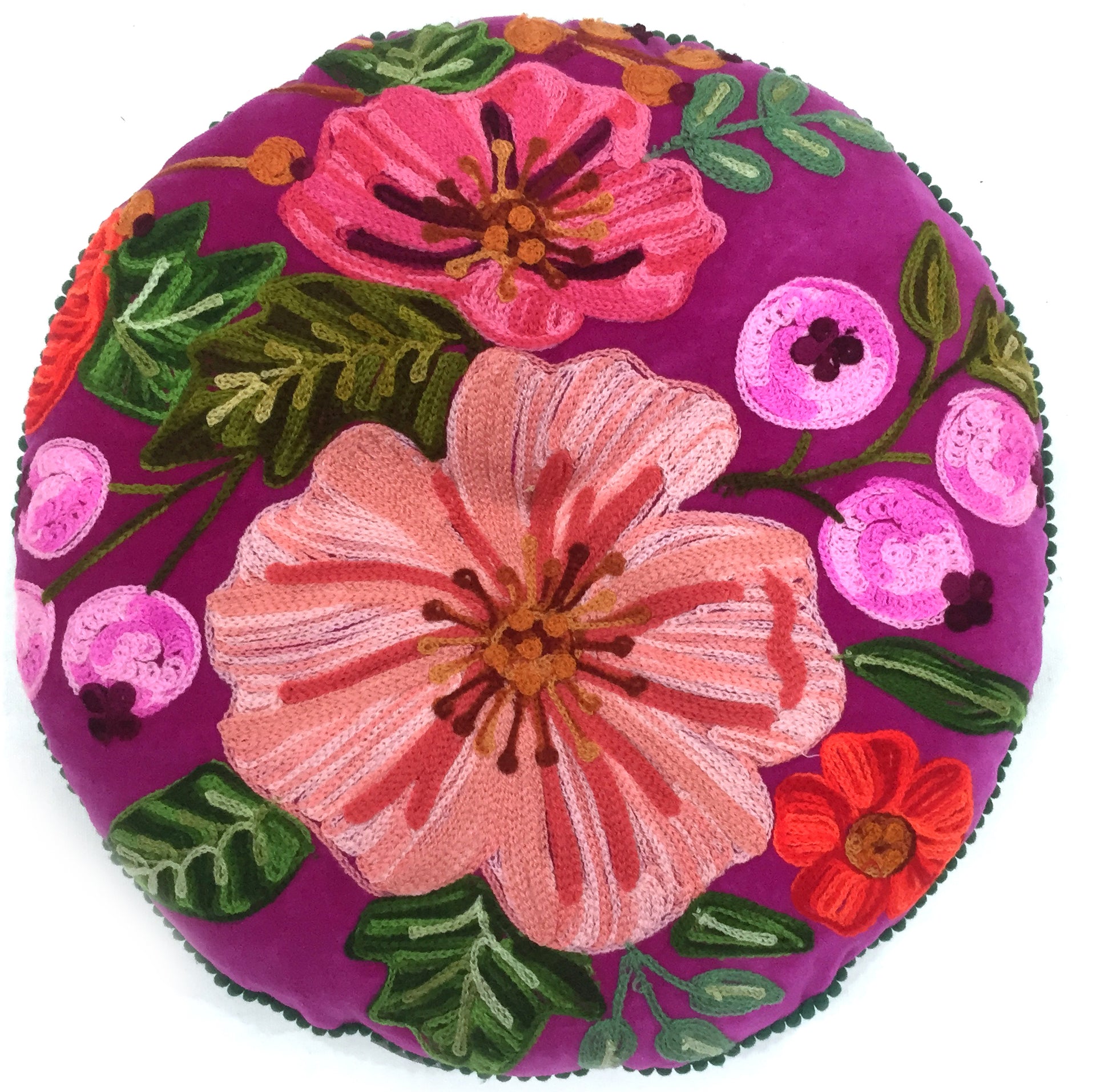 Rond fuchsia velvet kussen met handgeborduurde bloemen. Diameter 40cm.