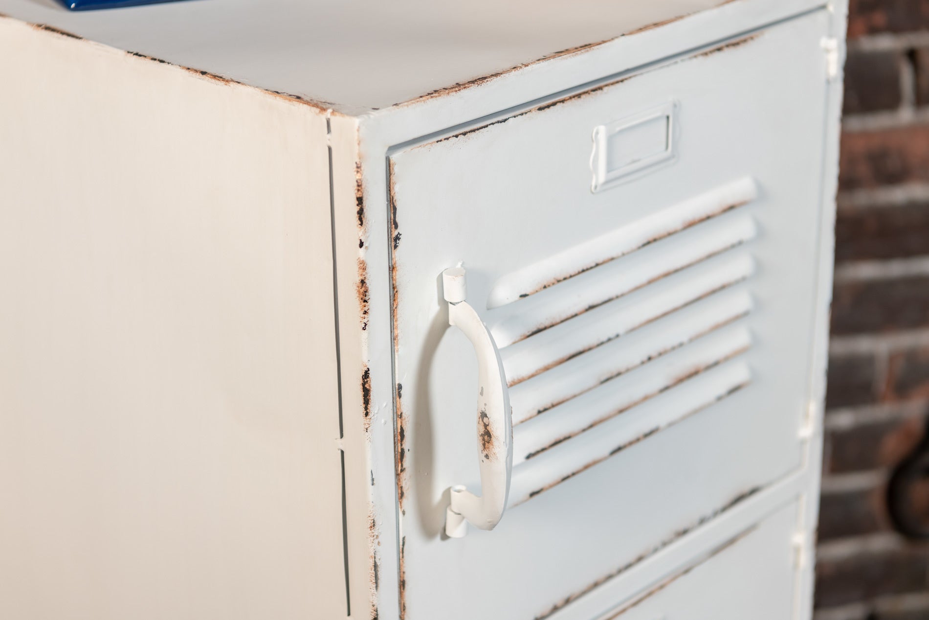En dit werd ‘m… de witte new vintage lockerkast. Hij heeft alles wat we tof vonden aan de oude lockerkasten: de roostertjes, de houdertjes voor name tags, de industriële scharniertjes, de echte lockerkastpootjes en natuurlijk de shabby witte lak die her en der wat roestig oogt. Maar ook al zet je ‘m in je badkamer, écht roesten, dat gaat íe niet!