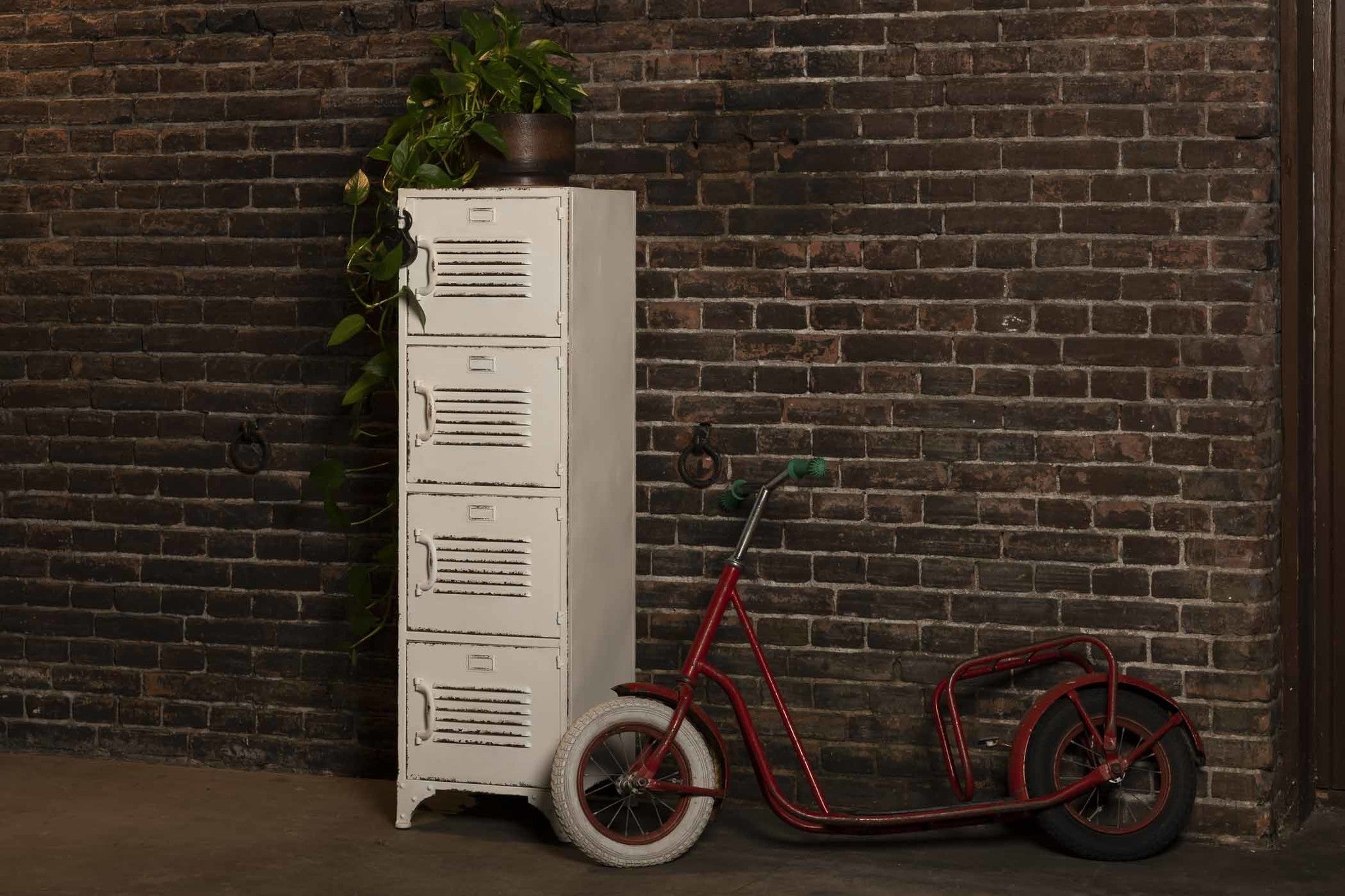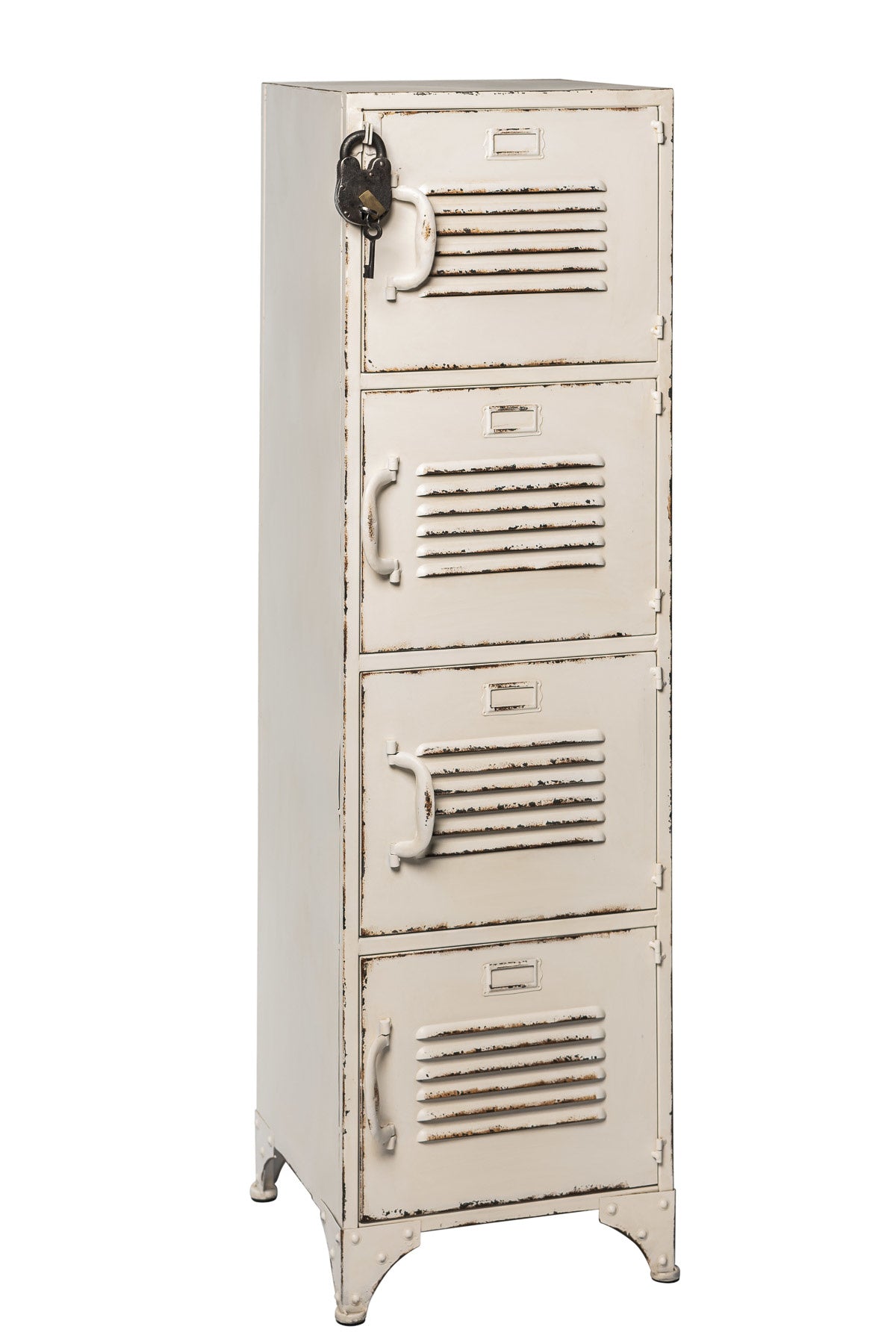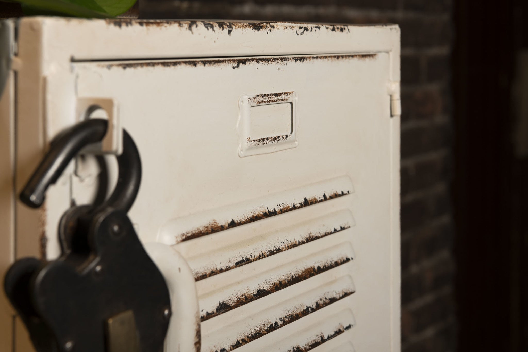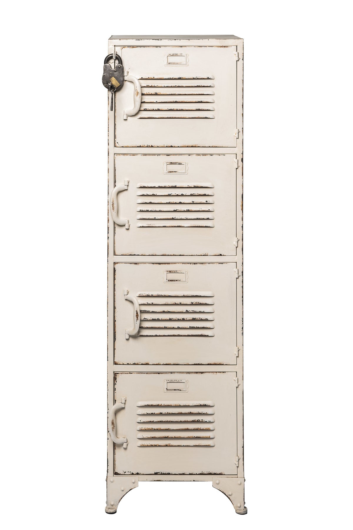Hoe maak je iets dat al ultratof is nóg toffer? Door er een enorm vintage hangslot aan toe te voegen! Op veler verzoek wordt onze witte 4-deurs new vintage lockerkast nu ook geleverd met ons befaamde new vintage hangslot. Natúúrlijk om er het bovenste kastje veilig mee af te kunnen sluiten, maar stiekem vooral omdat het gewoon een vet gaaf element is! Kijk even bij de zwarte vierdeurs lockerkast voor een detailfoto van het slot… need we say more?