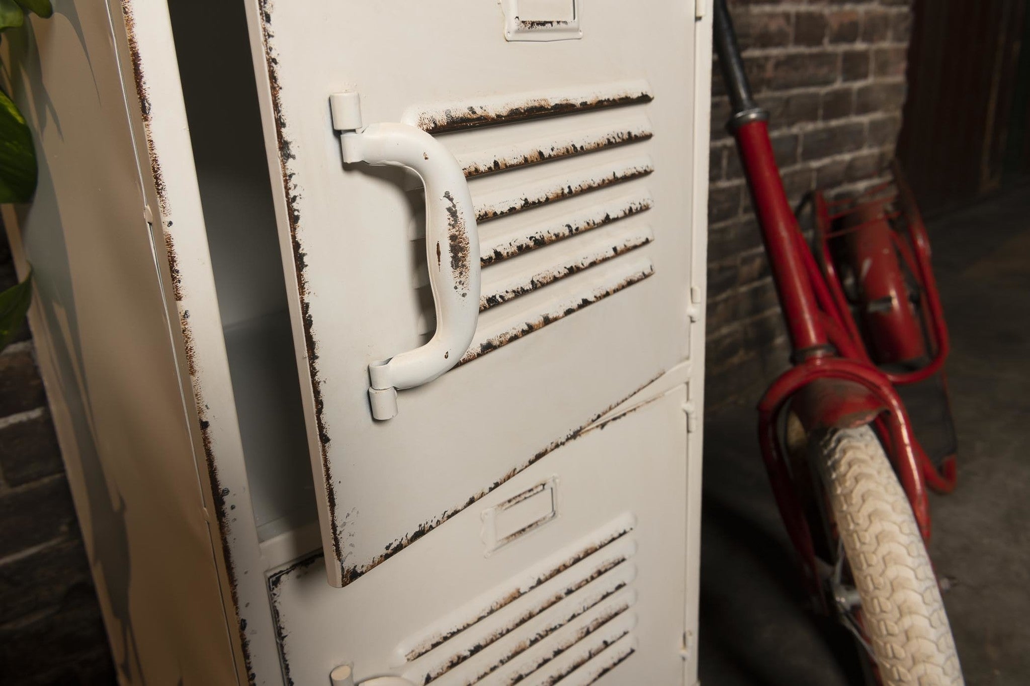 Afgezien van het meegeleverde slot en de extra gelaste haken aan het bovenste kastdeurtje, is het witte new vintage lockerkastje gelijk aan haar slotloze witte zus. Door de nabehandeling van de witte lak, oogt hij lekker shabby en oud. Hij is echter fris en nieuw. We vinden het namelijk niet zo lekker om onze schone handdoeken, sokken of servies in een oud, roestig vak te schuiven. Vandaar: New vintage! Door de roostertjes, taghouders, industriële scharniertjes en toffe pootjes, oogt hij echter alsof hij zo uit de kleedkamer van een oude fabriek werd geplukt.