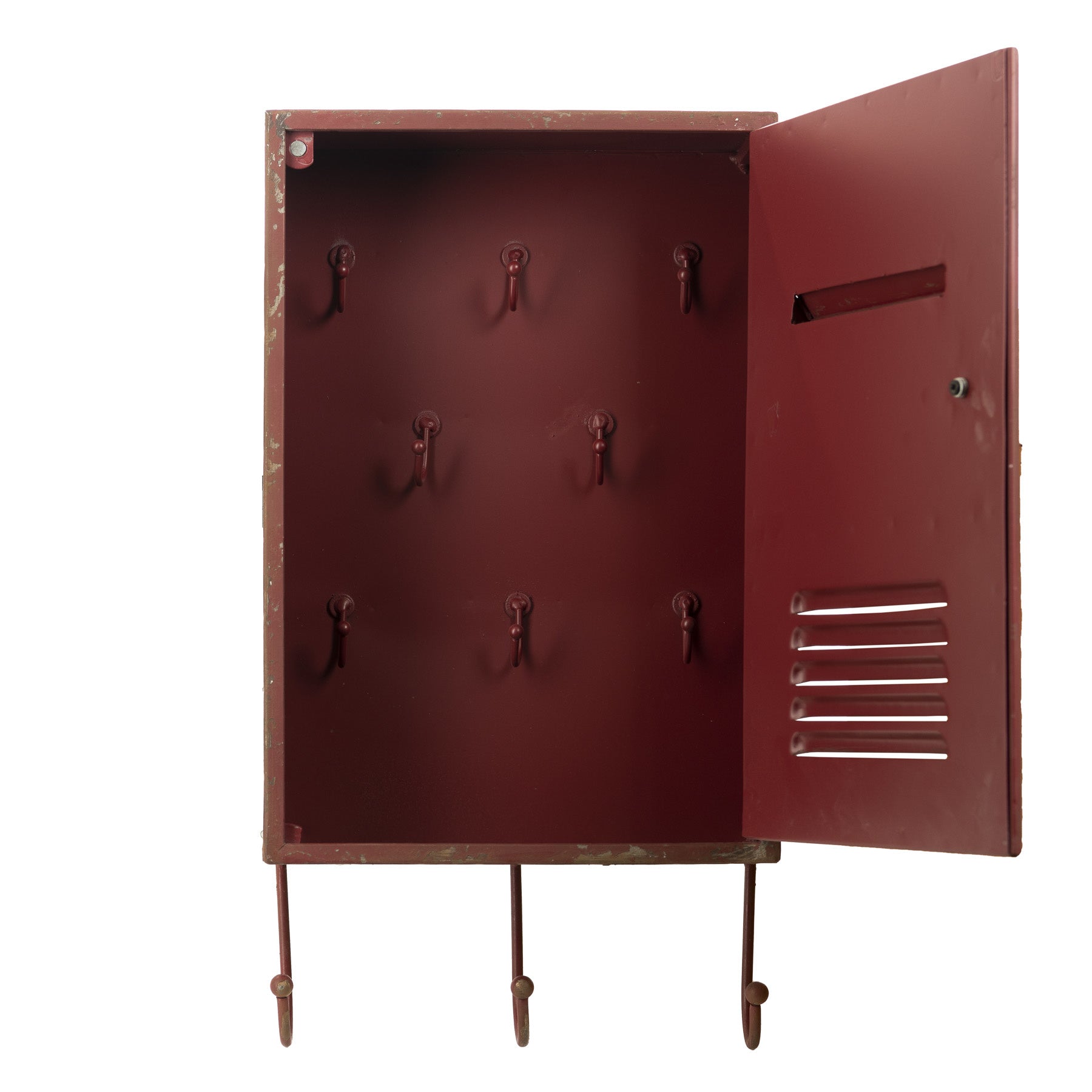 Nadat Lotte onze ontwerper bijna sméékte om een tof geel sleutelkastje te maken, was hij niet te stoppen! In navolging van het gele avontuur, kwam hij zelf spontaan met deze rode variant op de proppen. Door de verweerde roodbruine staalkleur, de op een locker geïnspireerde ventilatieroosters en natuurlijk de maar liefst 11 sleutelhaken, besloten we hem aan ons assortiment toe te voegen!